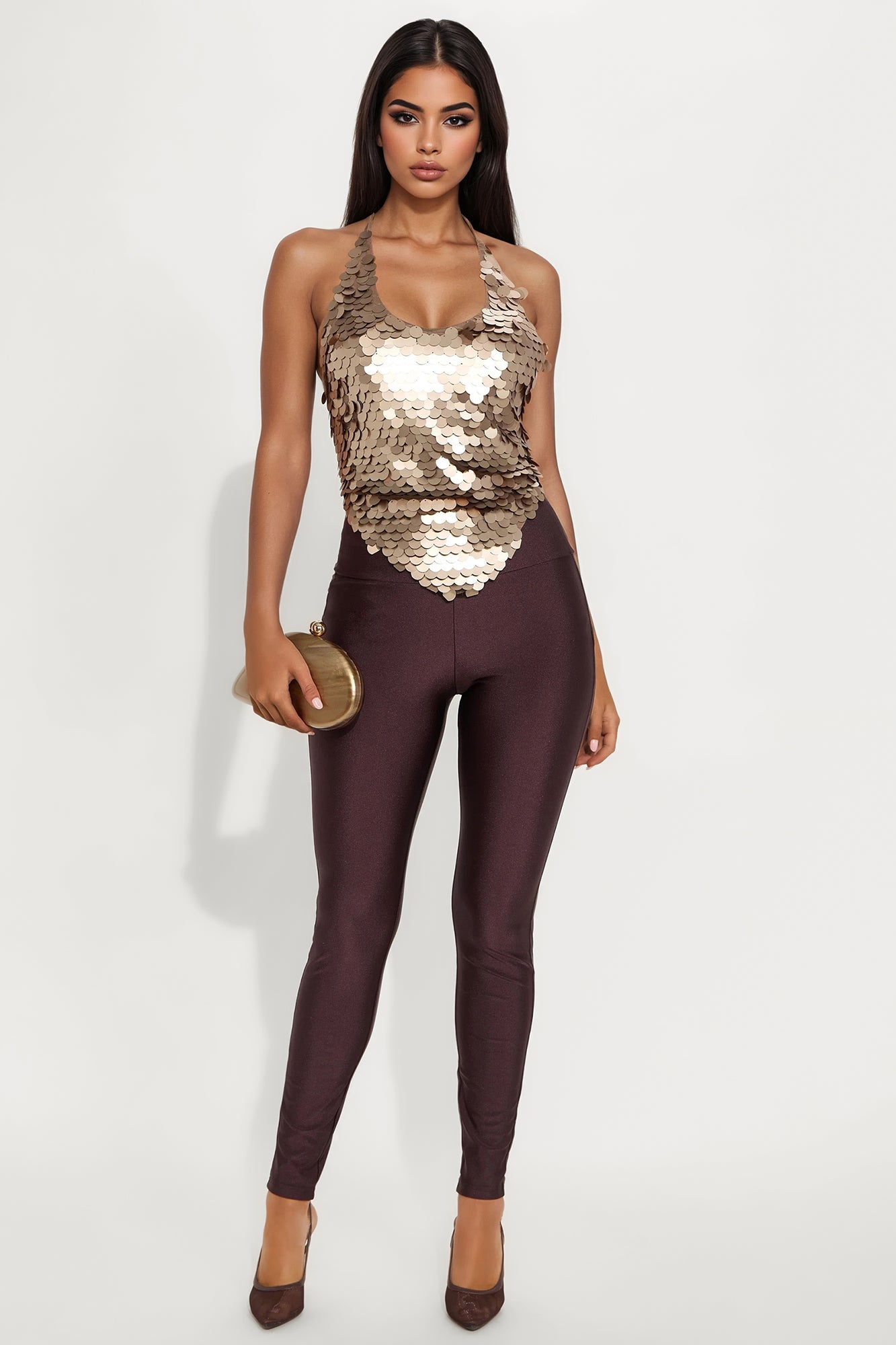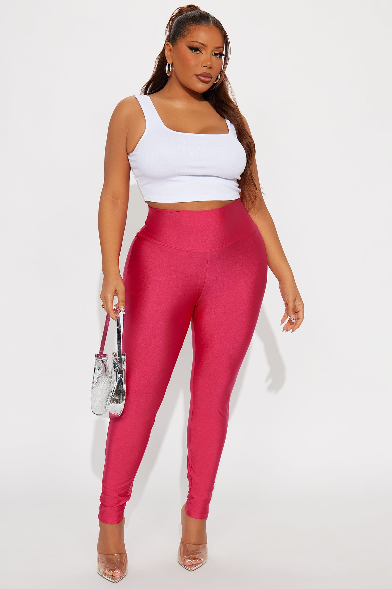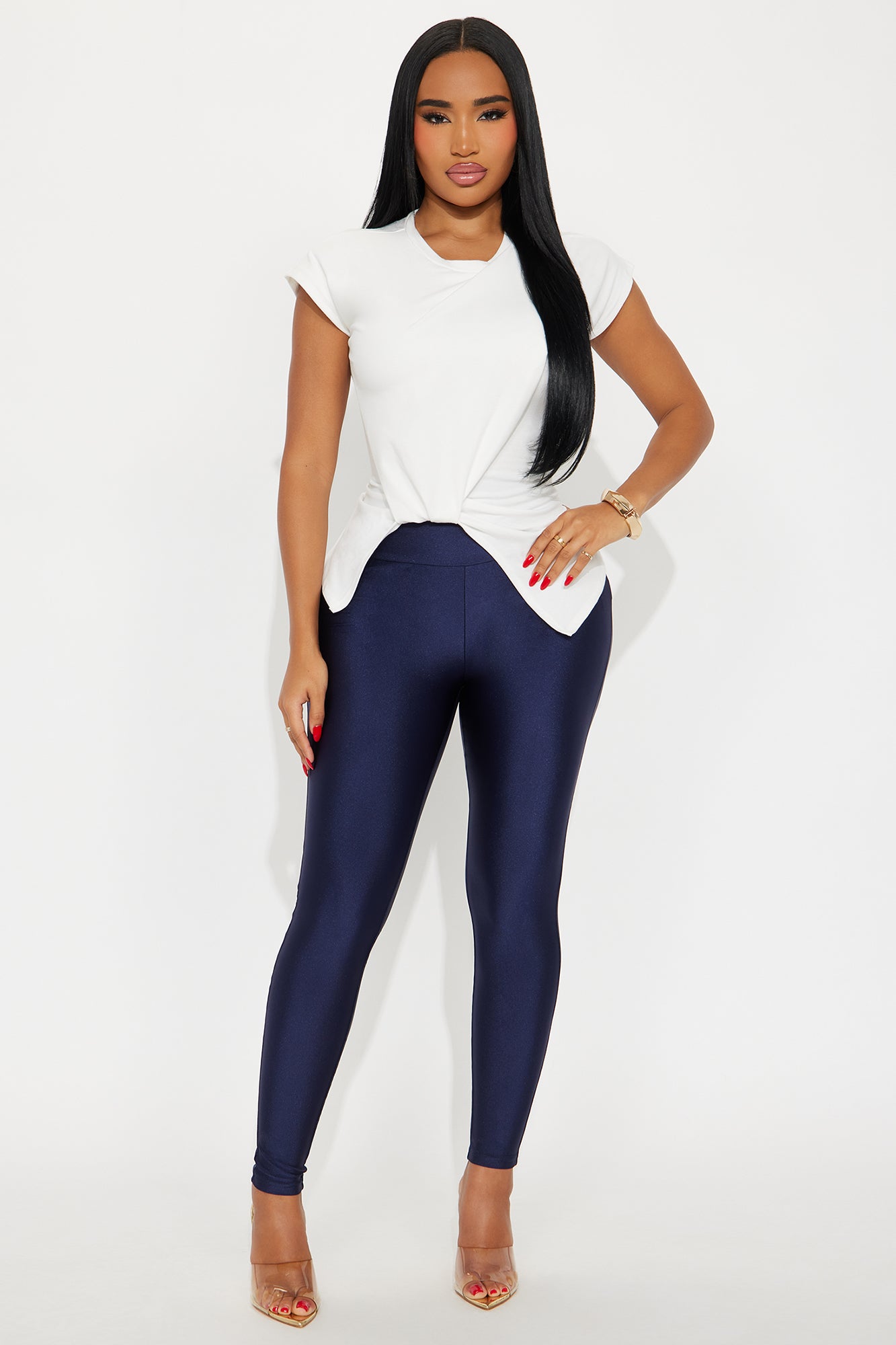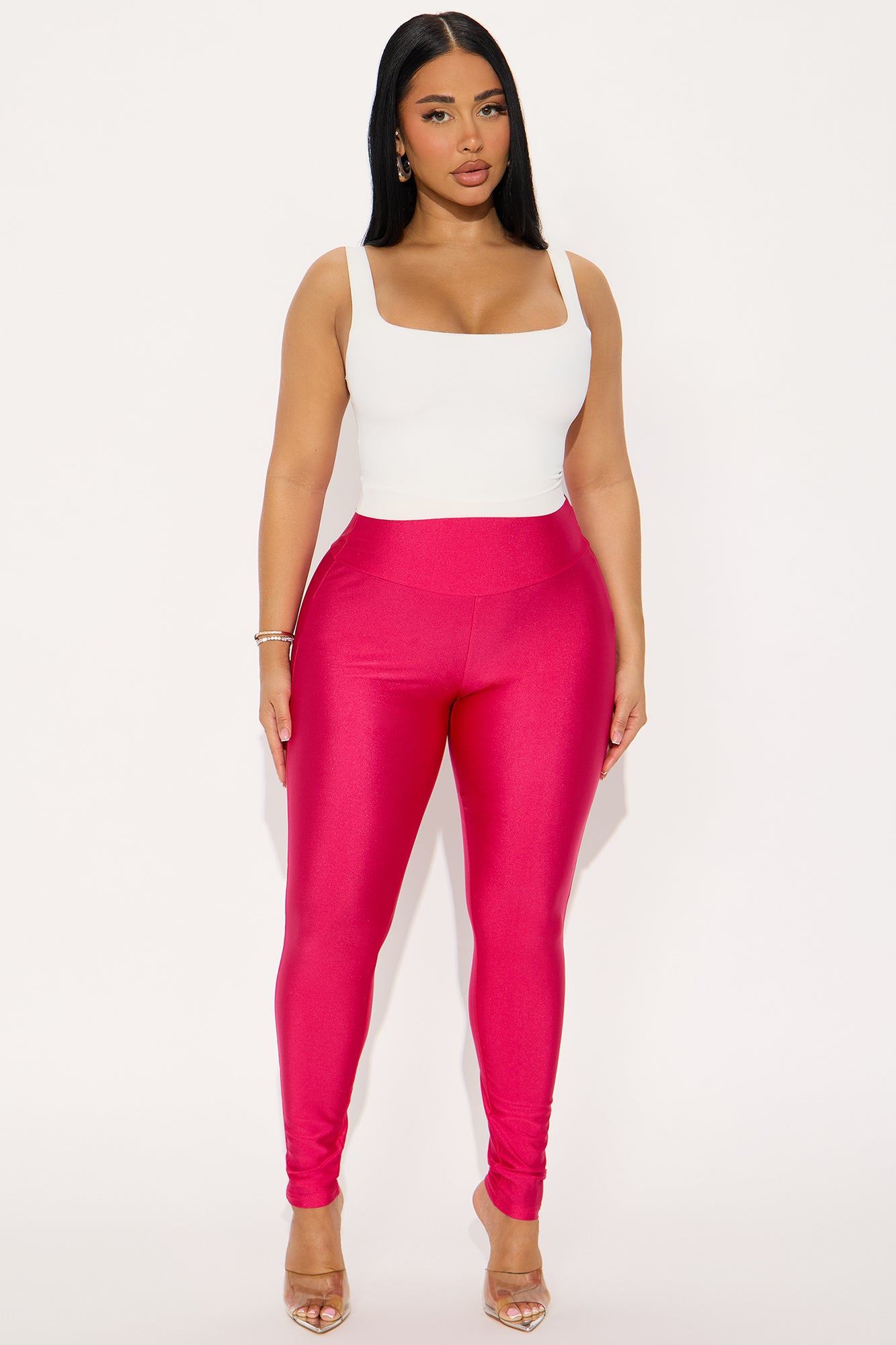 Available In Black, Chocolate, Eggplant, Magenta And Navy.High RiseSlinky FabricFull StretchWide WaistbandSkinny LegSelf: 82% Nylon 18% SpandexImported