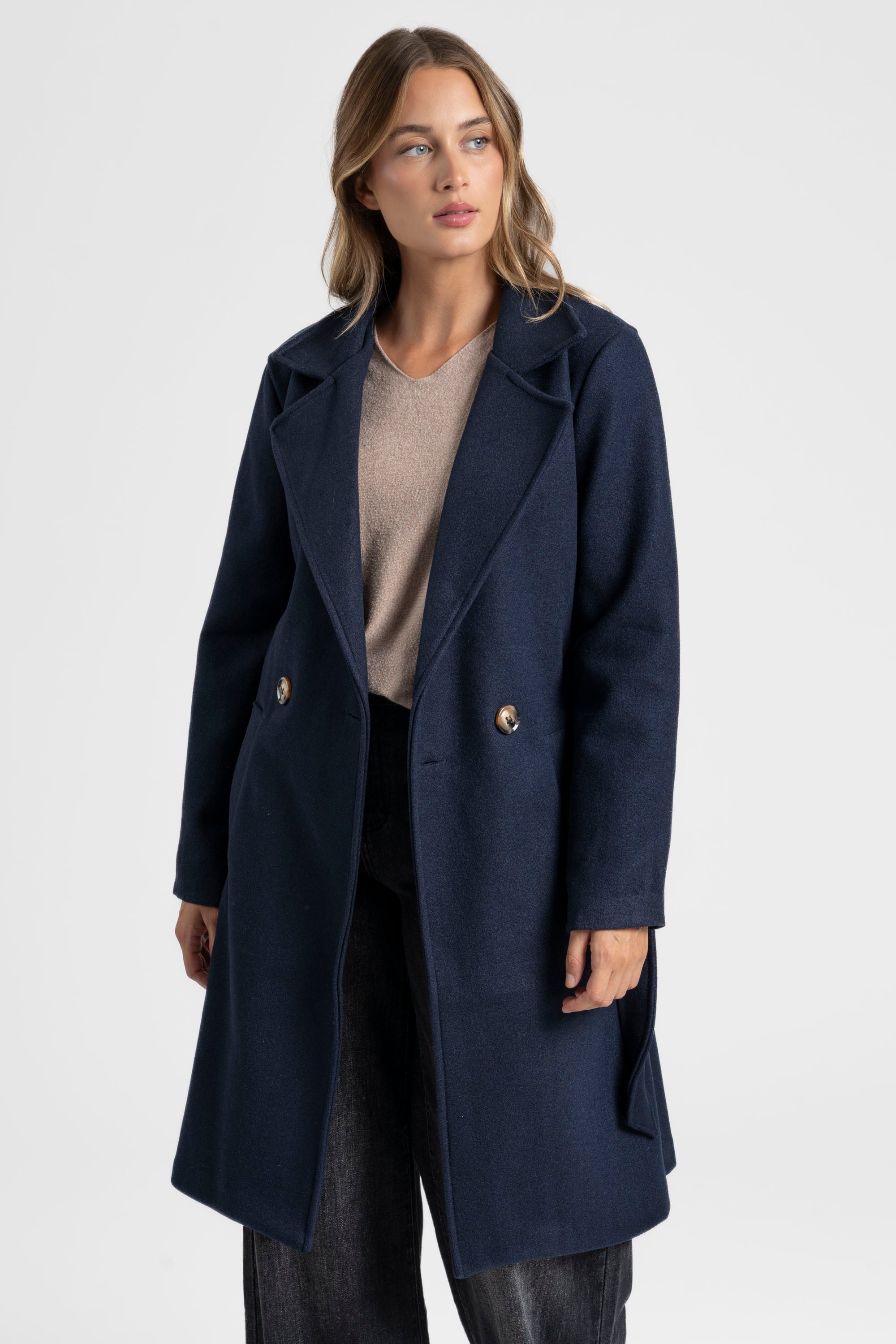 Tejido de paño. Diseño cruzado. Diseño recto. Cuello pico con solapa. Solapas con muesca. Manga larga. Dos bolsillos laterales. Cierre de botones en la parte delantera. Forro interior. Talla modelo: S. Altura modelo: 1,66 m.