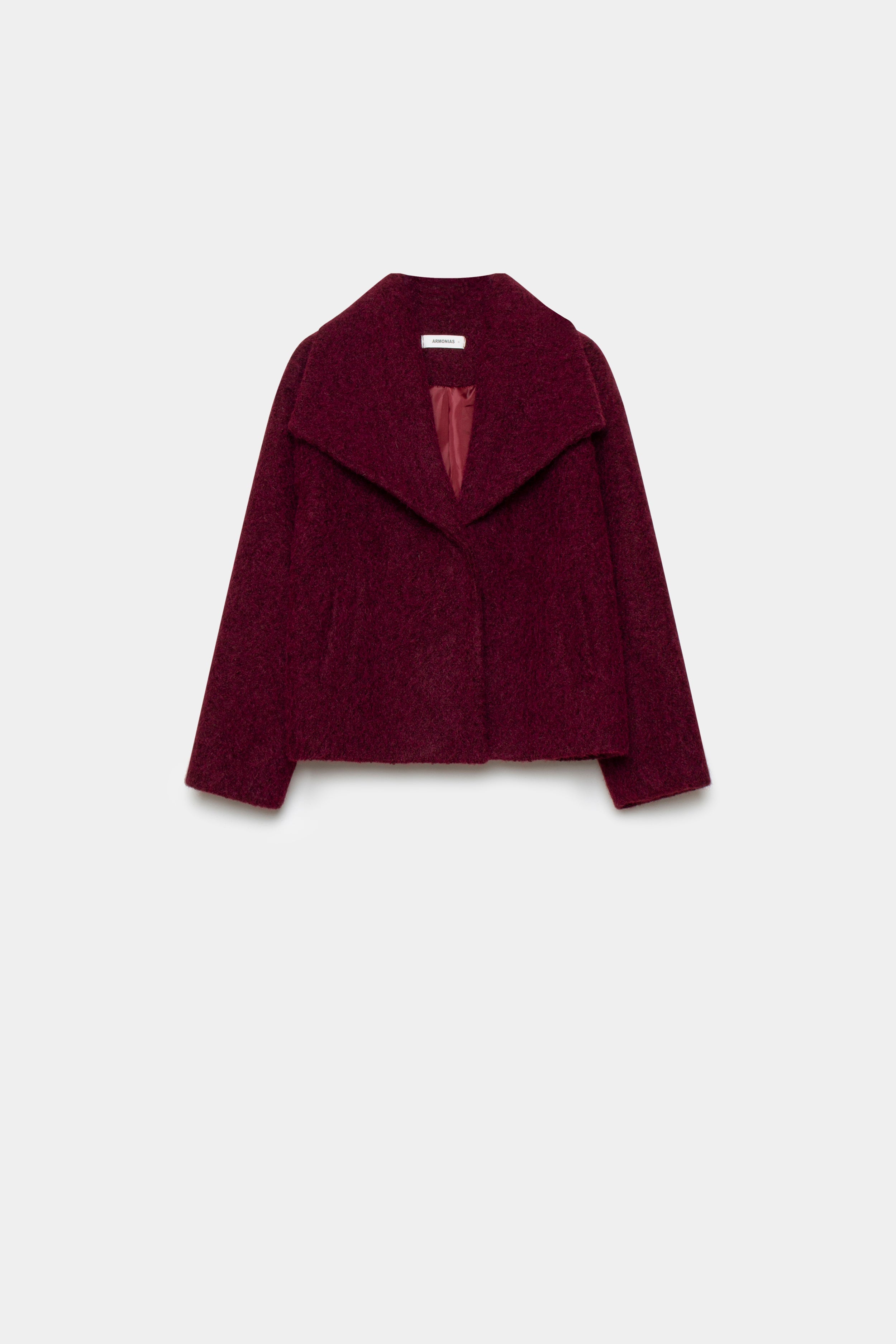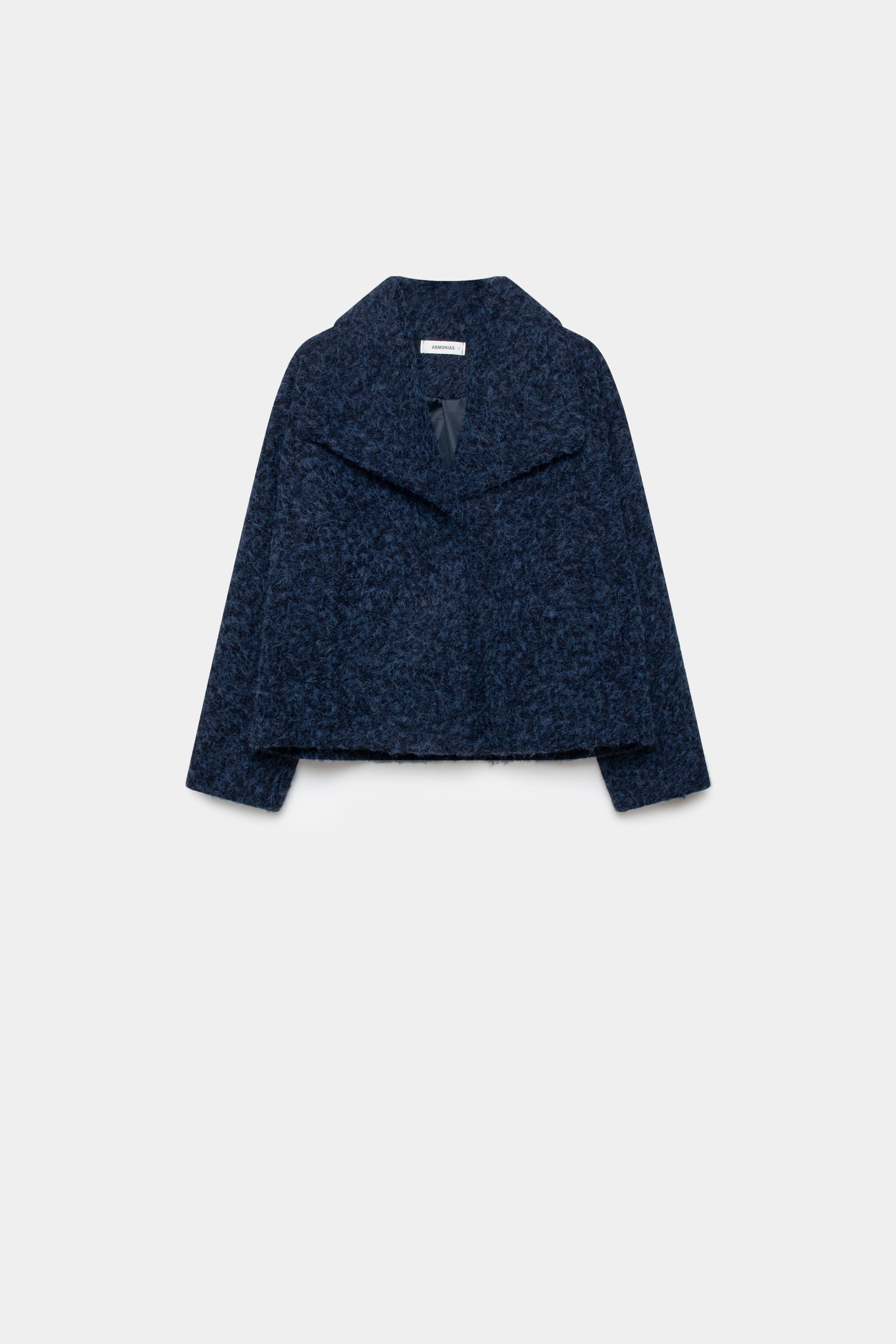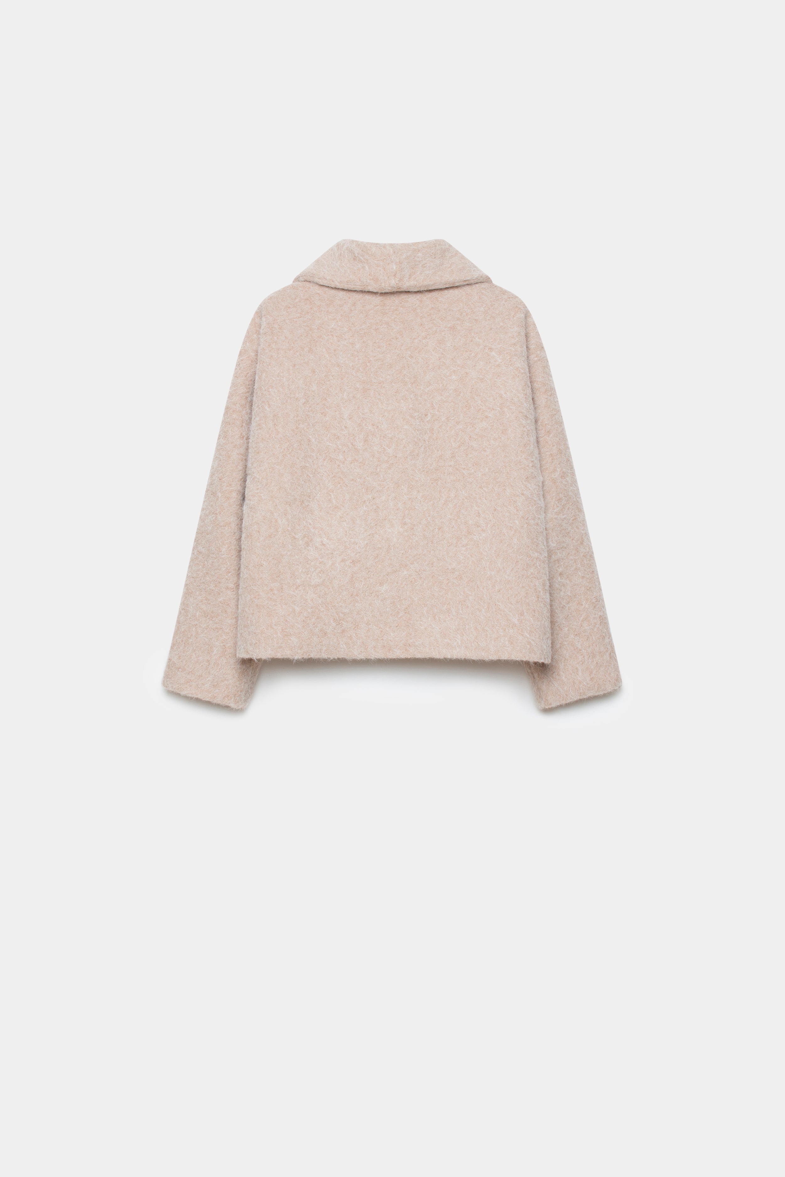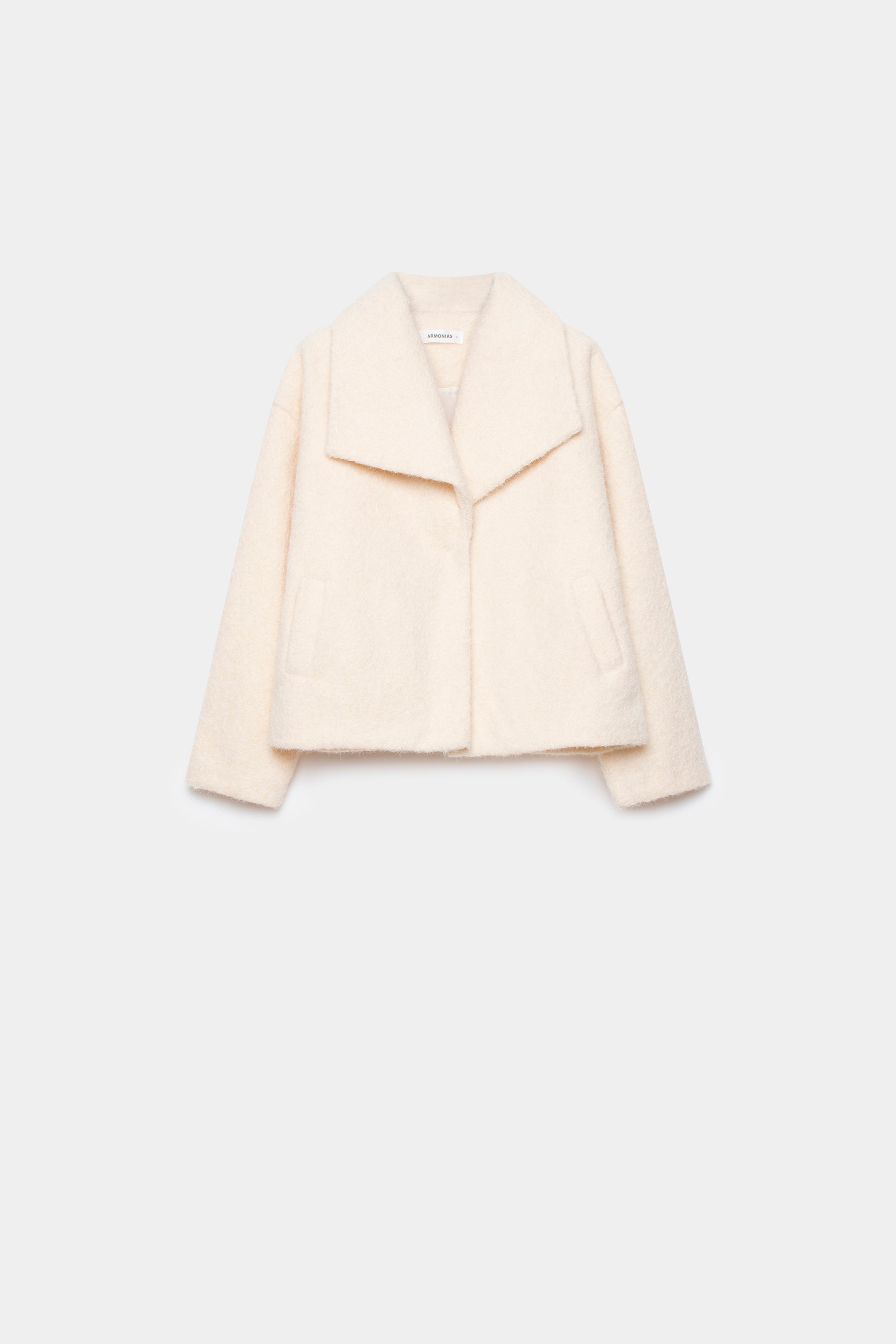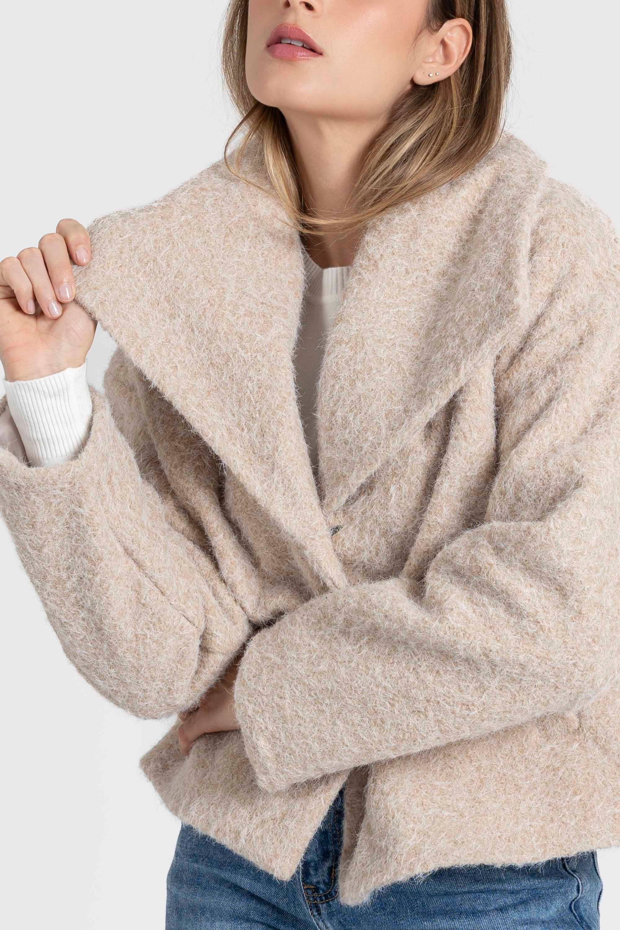 Tejido efecto pelo. Cuello solapa. Cierre de botón. Bolsillos laterales. Forrado. Diseño corto.