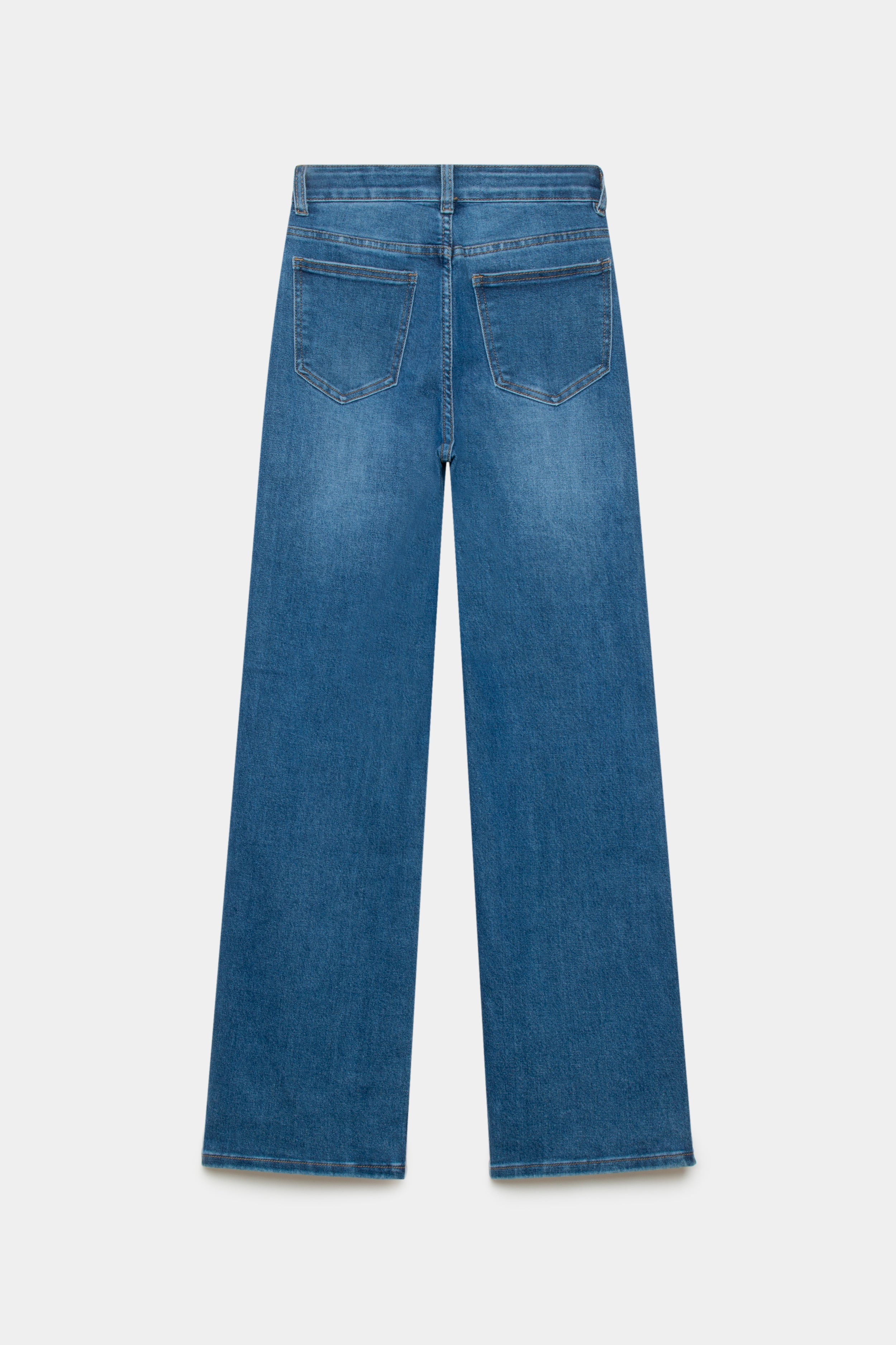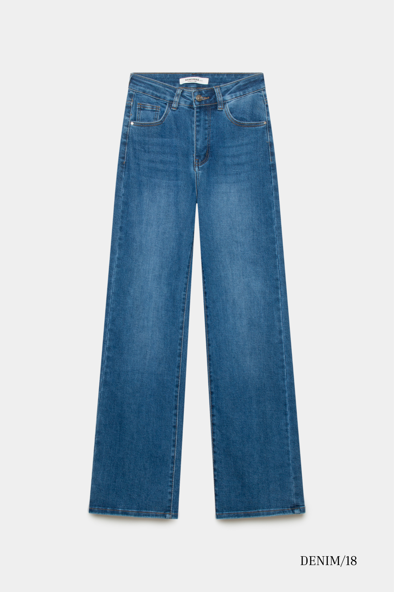 Tejido mezcla de algodón. Tejido tejano vaquero. Tejido elástico. Diseño recto. Diseño largo. Tiro alto.  Cinco bolsillos. Cierre de cremallera y botón. Trabillas.