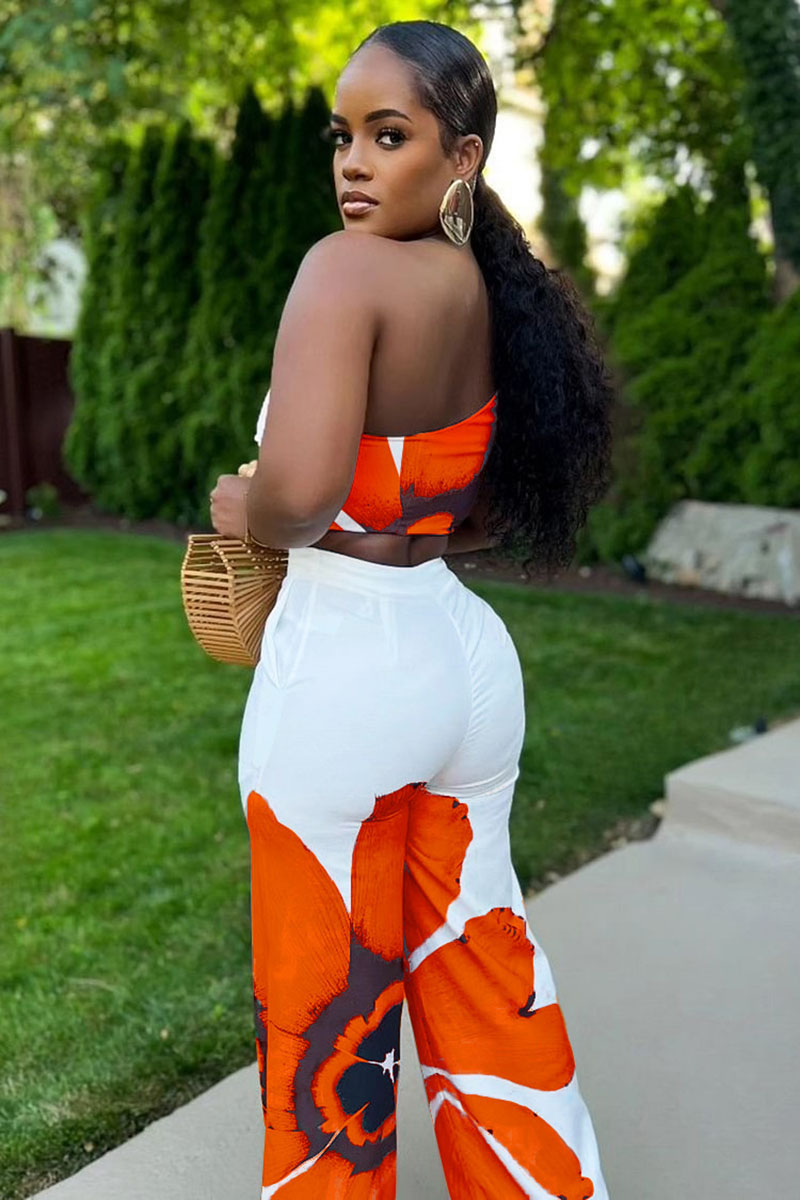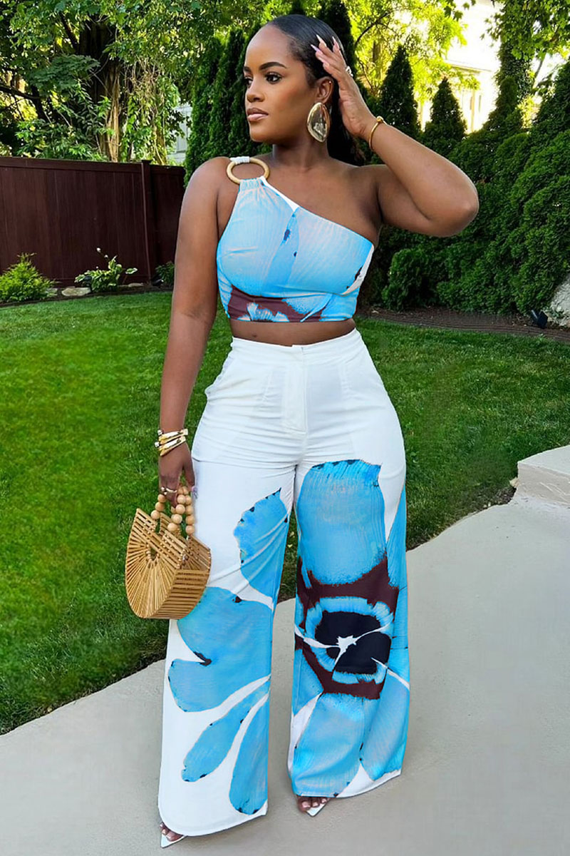 One Shoulder Crop Top Floral Wide Leg Pants Daily 2pcs Set-White