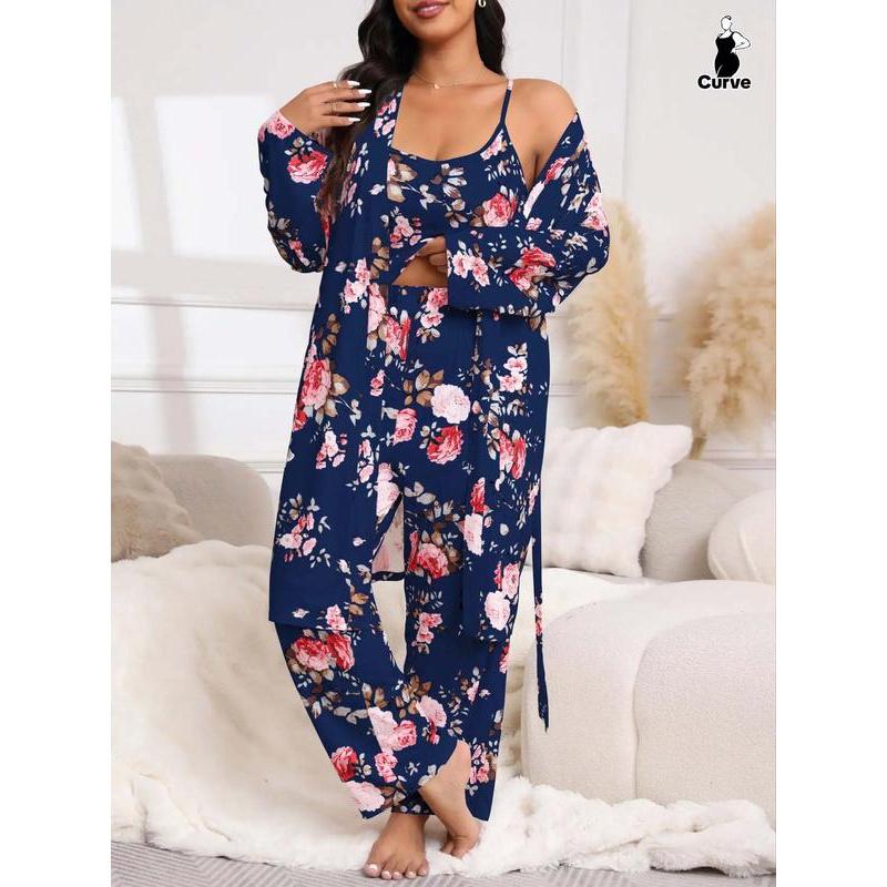 [Plus Size] Three-Piece Set Floral Print Belted Lounge Robe & Cami Top & Elastic Waist Pants Pyjama Set, Elegant Comfy Drop Shoulder Long Sleeve Robe & Sleeveless Top & Bow Decor Trousers PJ Set, Women's Sleepwear for Spring & Fall