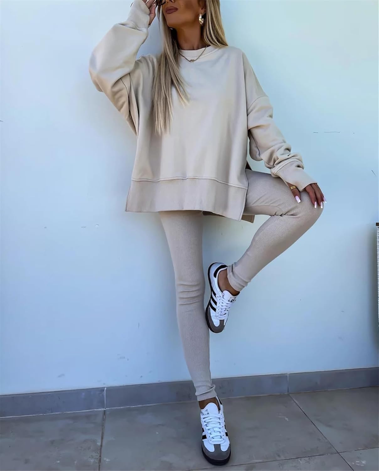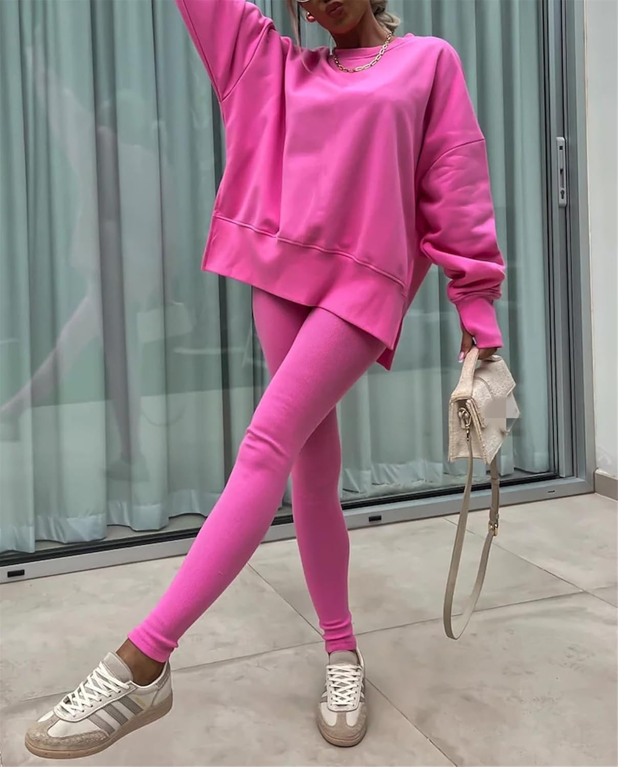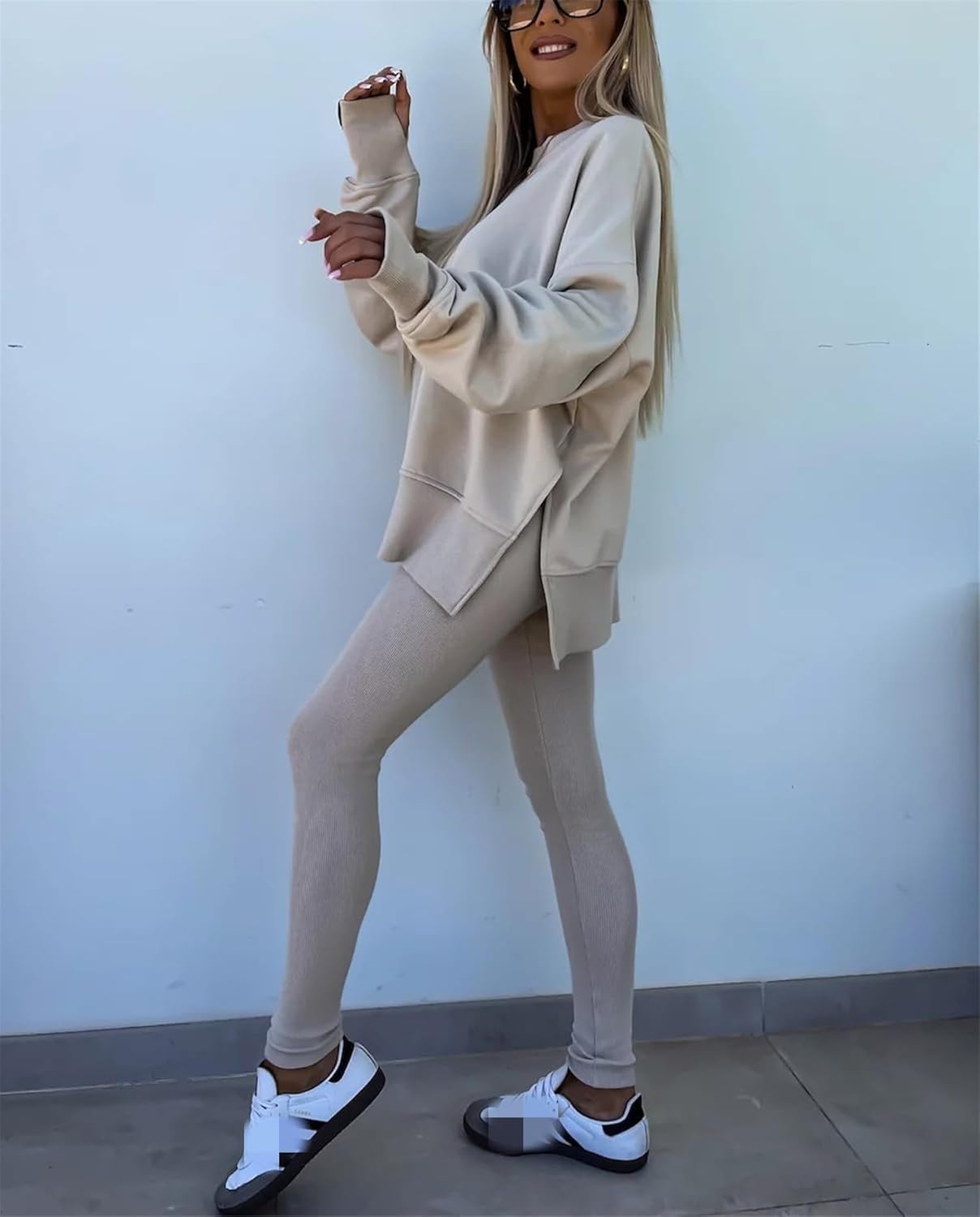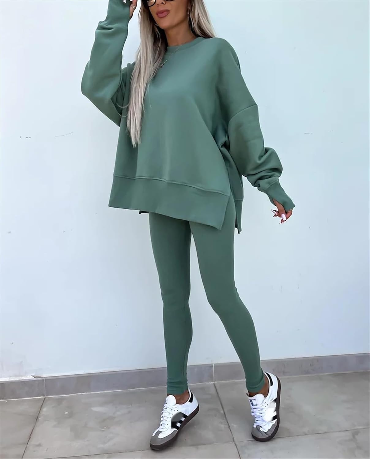 Feature: Pants sets women 2 piece outfits, solid color set, long sleeve oversize sweatshirt with thumb hole, stretchy skinny pants, slim fit yoga outfit for women, streetwear style