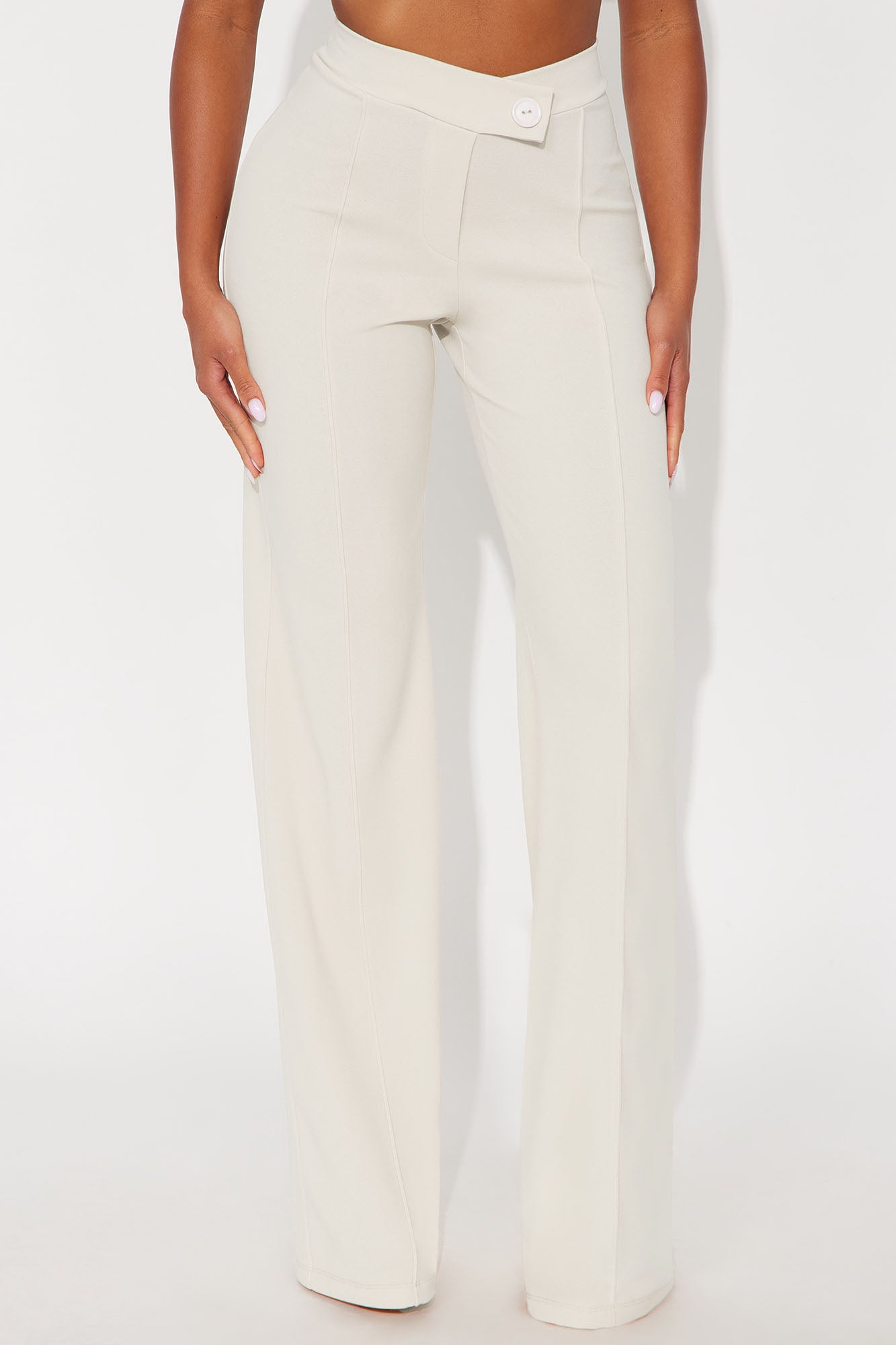 Available In Black, Charcoal, Chocolate, Oatmeal, Taupe And White.Available in Regular, Tall , and Petite InseamsWide Leg Dress PantsTall 36" InseamAsymmetrical Button DetailBack Zipper ClosureFront Seam DetailClean Finish HemStretchCrepe KnitHigh WaistHigh Rise95% Polyester 5% SpandexImported