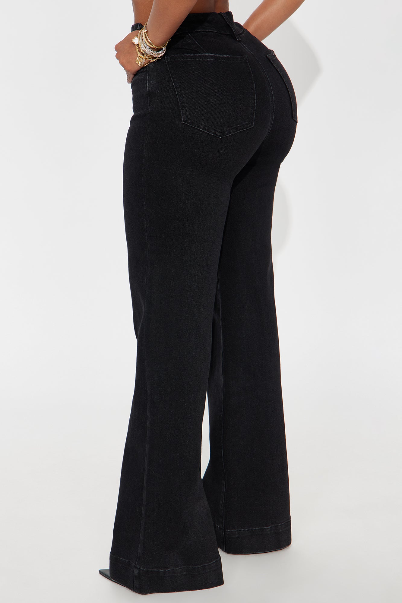Available In Black Wash And Medium Wash.Trouser Flare JeanTrouser Pockets12" High Rise34" Inseam24" Leg OpeningLow StretchDisclaimer Due To The Specialized Wash Process, Each Garment Is Unique.98% Cotton 2% SpandexImported