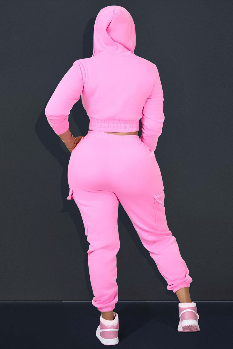 Zip Crop Hoodie Drawstring Pockets Plain Jogger Pants Matching Set-Green