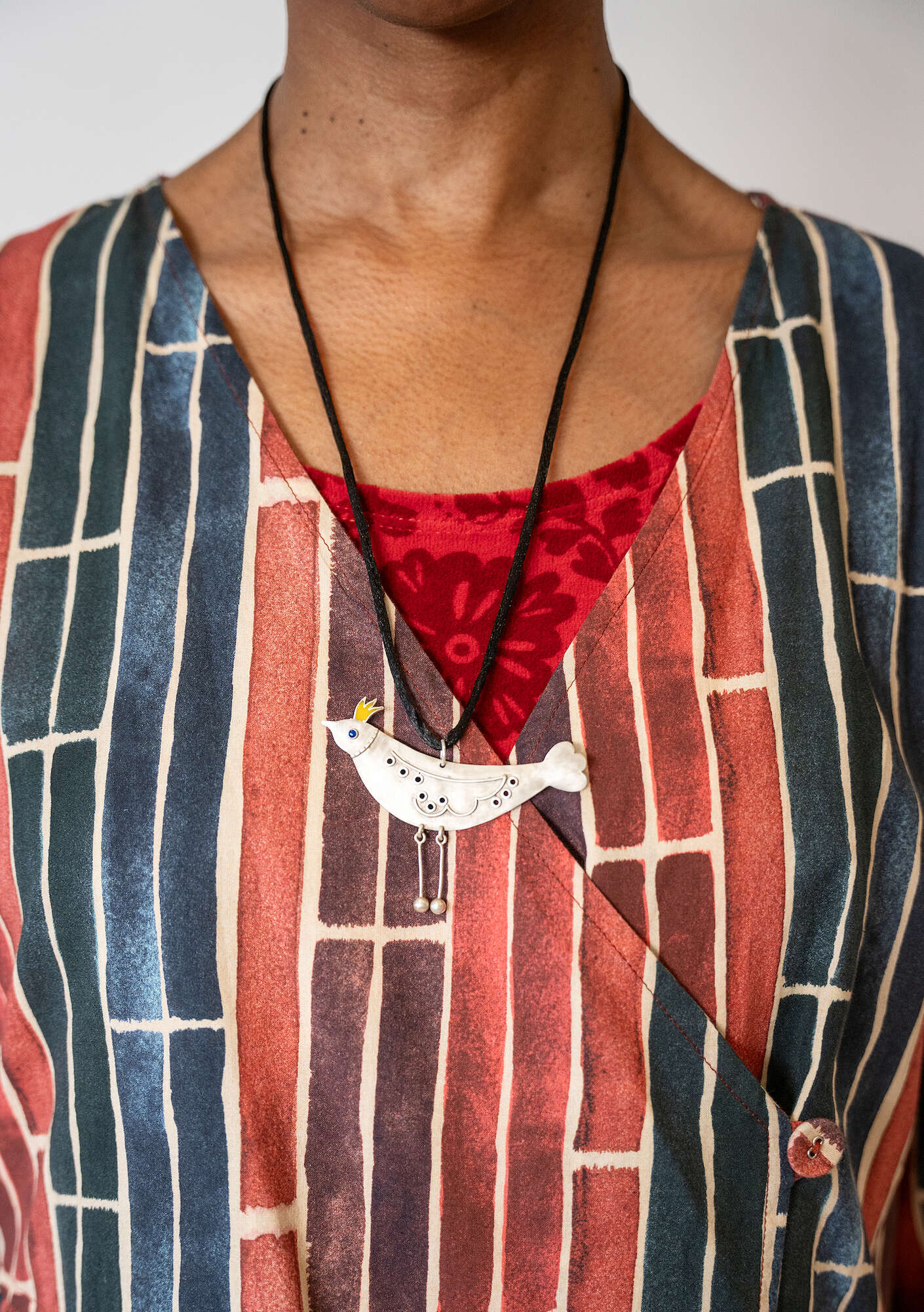 Charming necklace with a 925 sterling silver, bird-shaped pendant, in relief and with details worked in enamel. 62-cm-long cord with a silver clasp. Comes in a small cloth bag with a printed design.