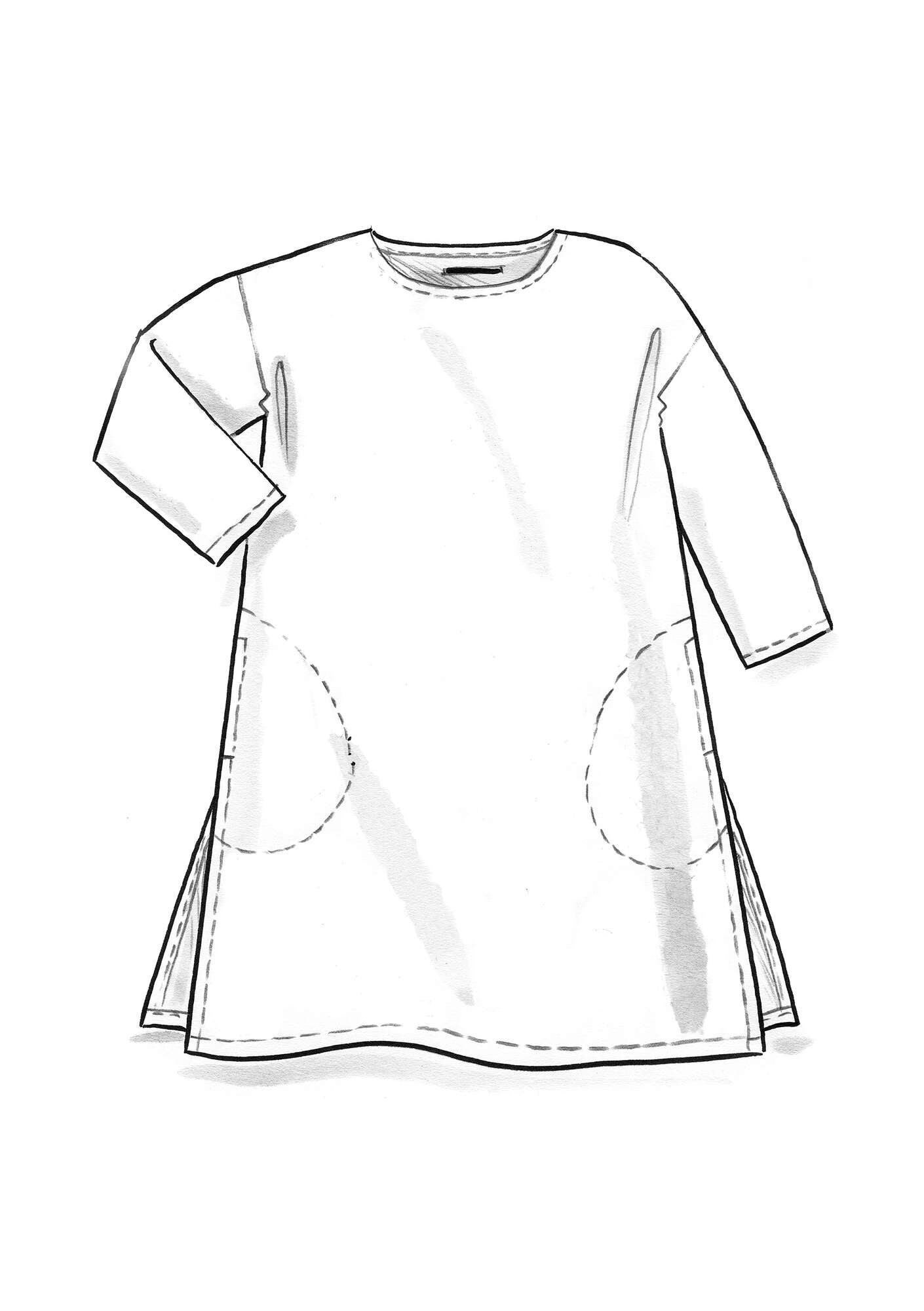 • A comfortable dress with a straight silhouette. Shorter length with sleeves that fall just below the elbow. Slightly dropped shoulder seams. Practical pockets and neat side slits.