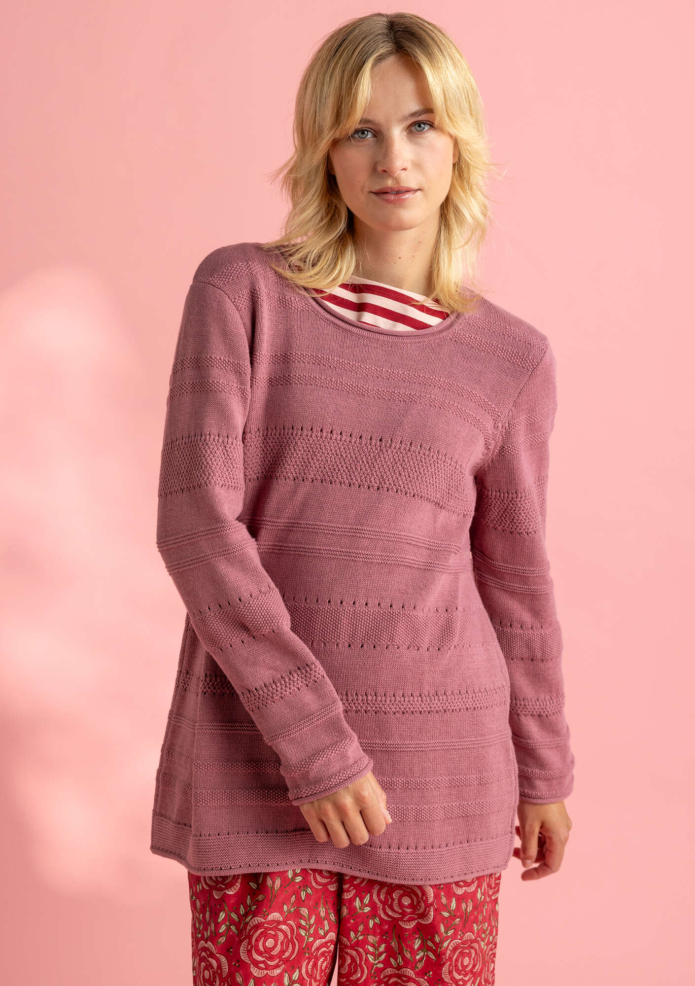 • Easy-to-wear sweater with full-length sleeves. Textured stripes and small, neat borders in a pointelle knit. Pretty rolled-edge cuffs and hem. Comes in solid colours and multicoloured.