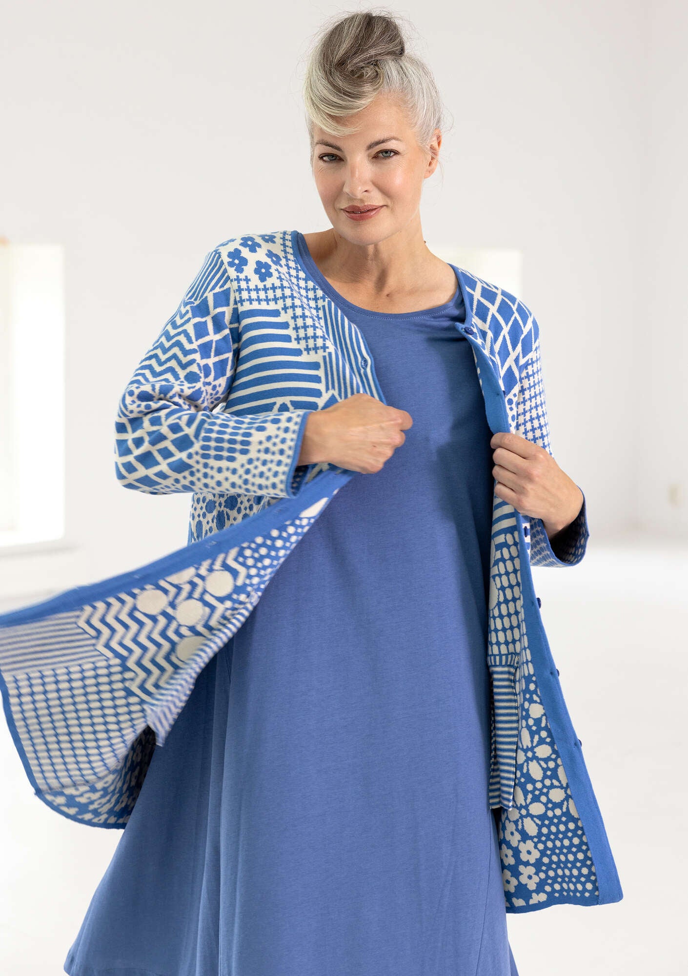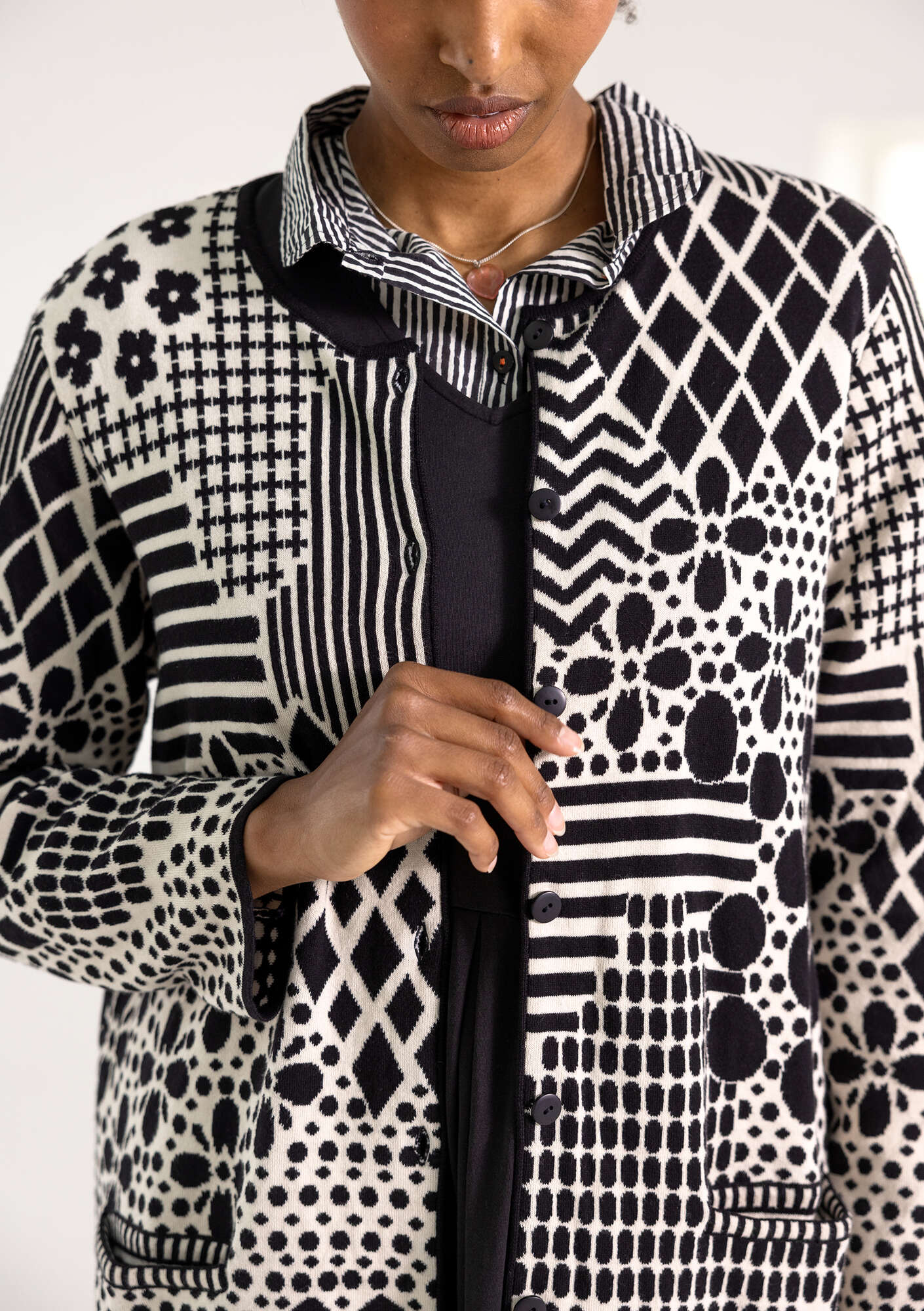 Jacquard cardigan with full-length sleeves. Double-sided, two-tone pattern in easy-wear colours. Extremely beautiful on the inside too. Subtly designed pockets, striped inside. Dyed buttons.