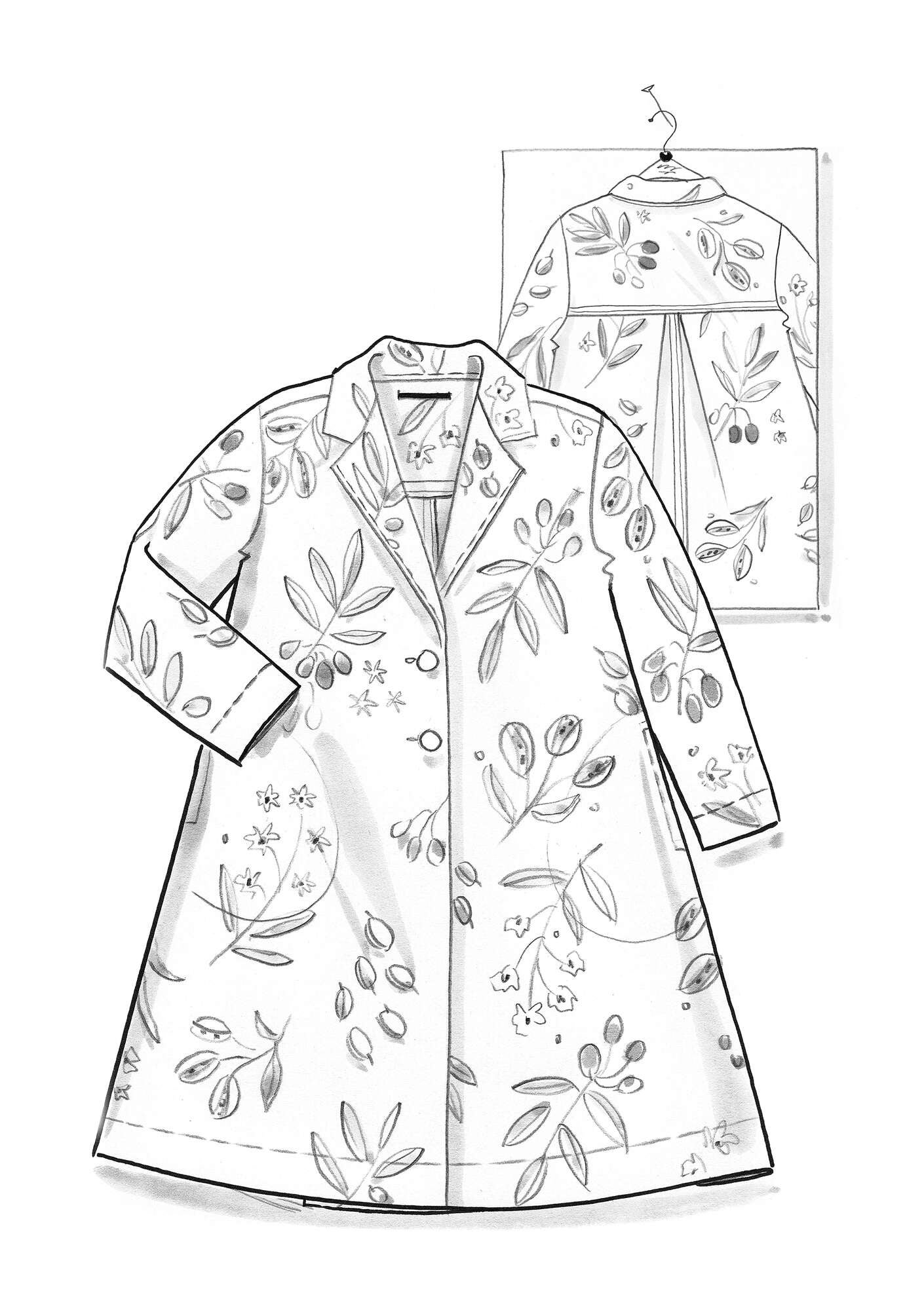 Unlined style available in solid black and with a digitally printed design rendered in two colour schemes. Featuring a notched lapel collar, side pockets, fabric-covered buttons and a back yoke with a box pleat that creates subtle volume through the coat.