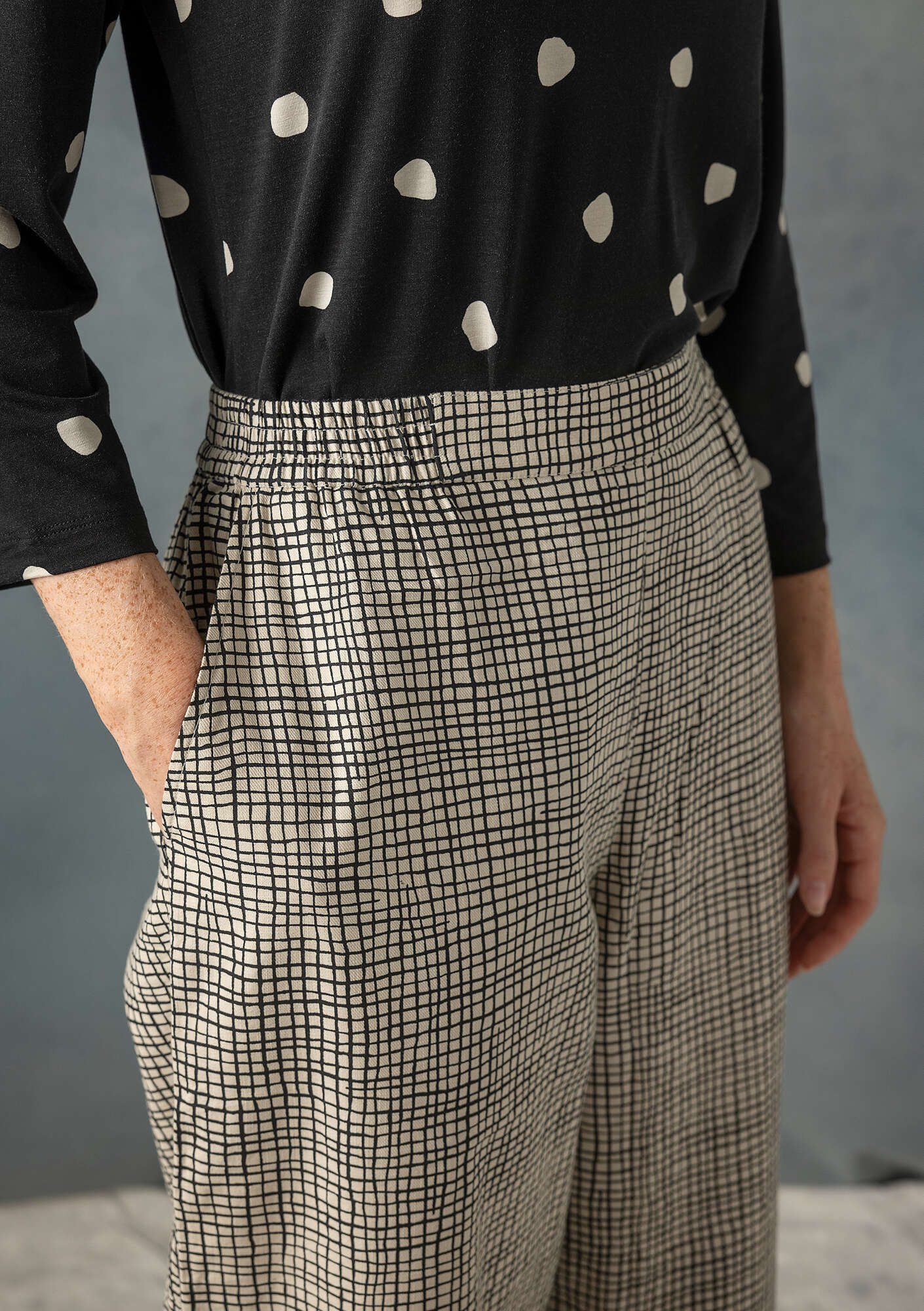 Cut from comfortable cotton twill printed with a neat check pattern inspired by cobblestones. Ankle-length trousers with an elasticated back and side waistband. Two front box pleats and side pockets. The lower leg is stylishly shaped by the attractive diagonal stitching.