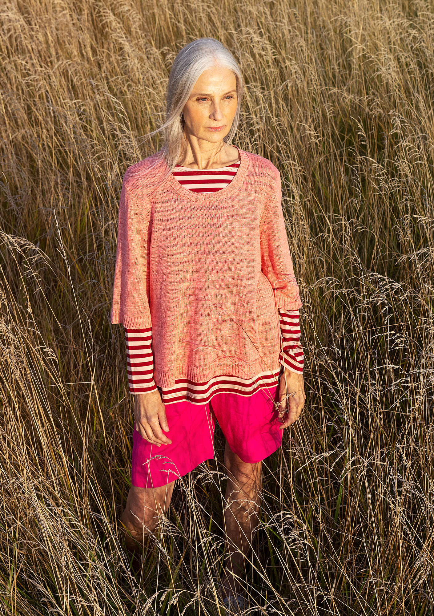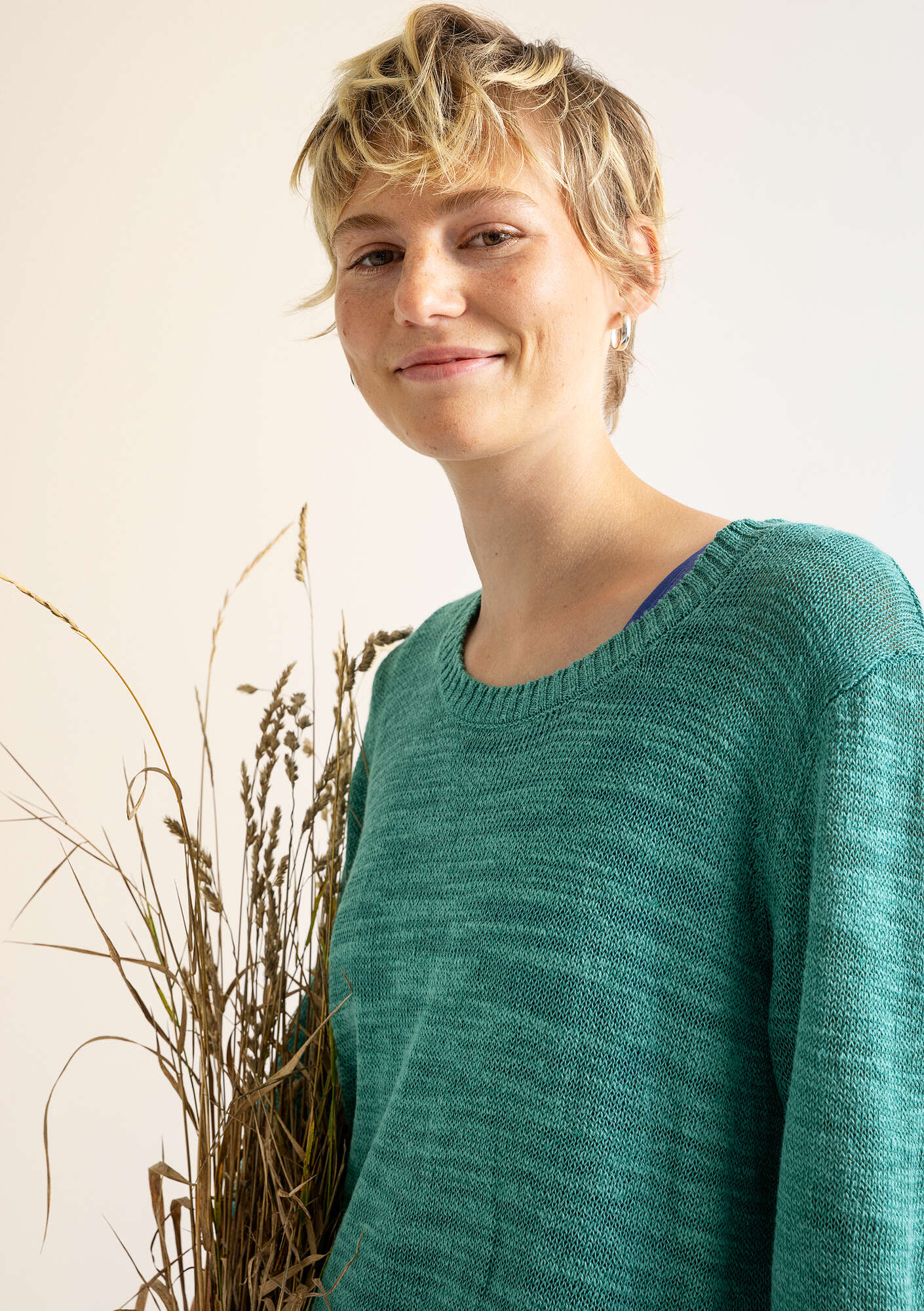 Straight, boxy silhouette with elbow-length sleeves. Knitted with a gorgeous linen blend yarn with a slightly thicker feel. Rib-knit cuffs and hem and a round neckline.