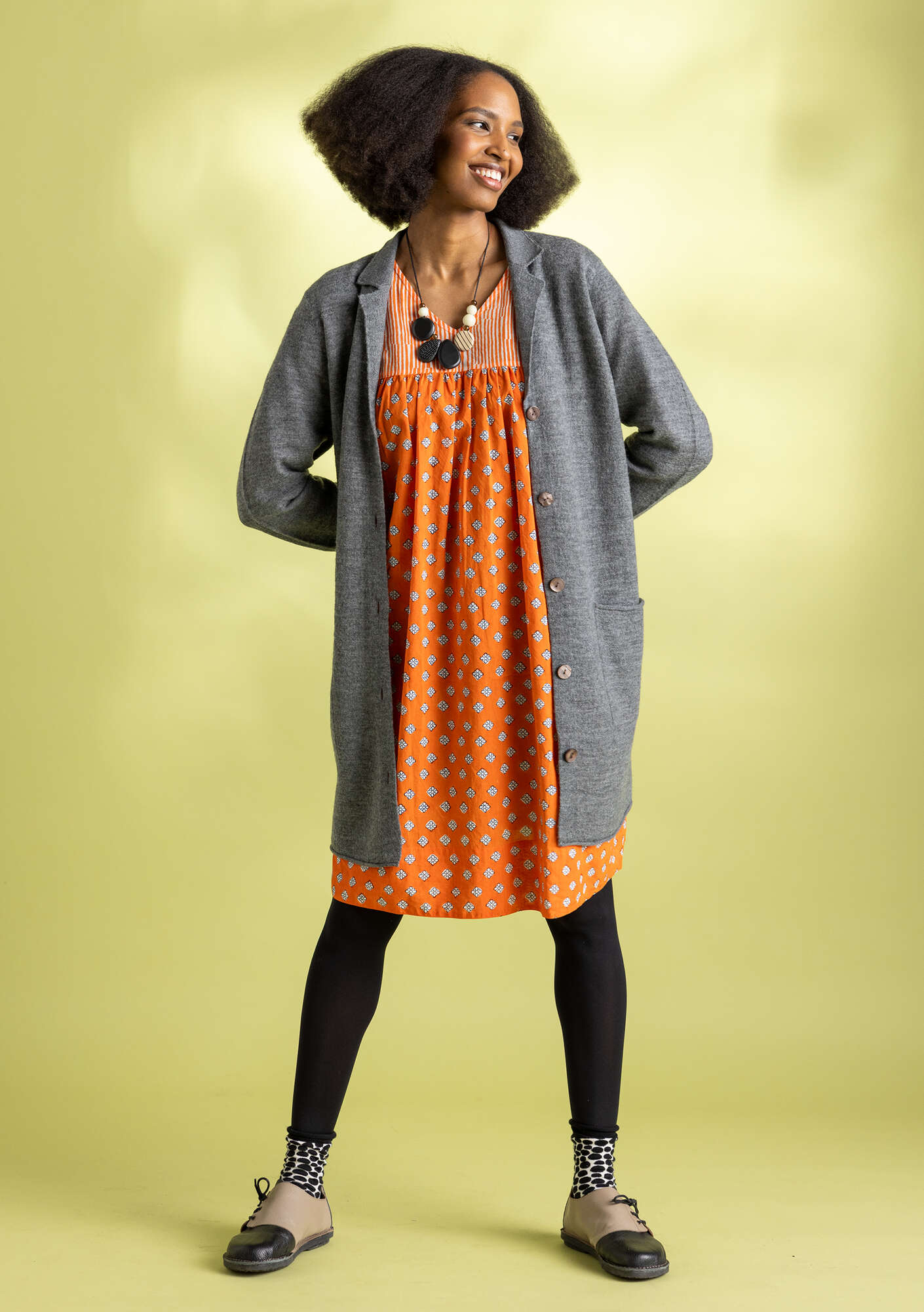 • 100% wool. The wool is non-mulesed and certified organic. The dyeing process is certified as compliant with environmental standards. Even the finest of wool fabrics may show some pilling after repeated wear. Carefully remove any pilling by hand. We recommend airing the garment outdoors or steaming with an iron. If absolutely necessary, hand wash at 30° or machine wash on the wool cycle. Use a detergent specifically for wool. Reshape the garment while damp and dry flat. Store horizontally. 4-5% shrinkage. Made in Dongguan, China.