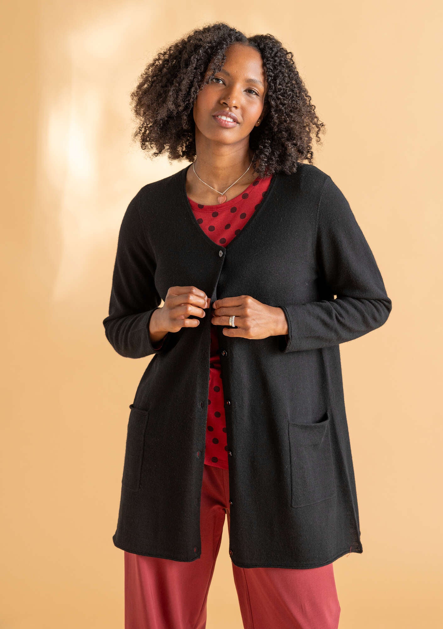 V-neck cardigan with full-length sleeves. Shaped at the top, flaring gently towards the hem. Neat rolled edges. Patch pockets and dyed mother-of-pearl buttons. Colour accent details on the inside.
