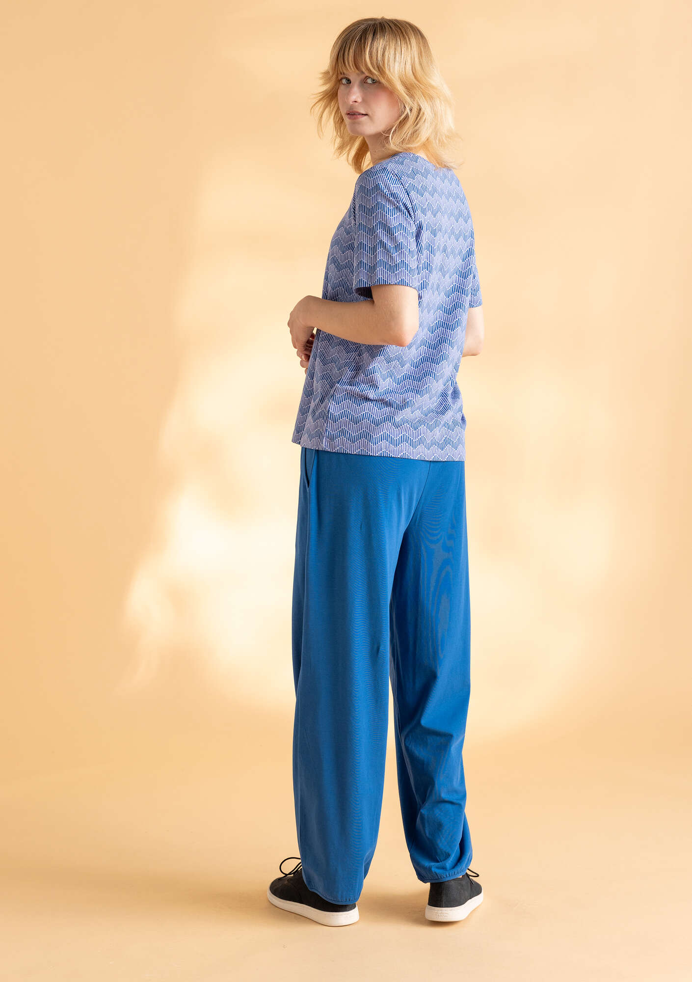 • Solid-colour harem trousers with a comfortable elasticated waistband. Practical side pockets.