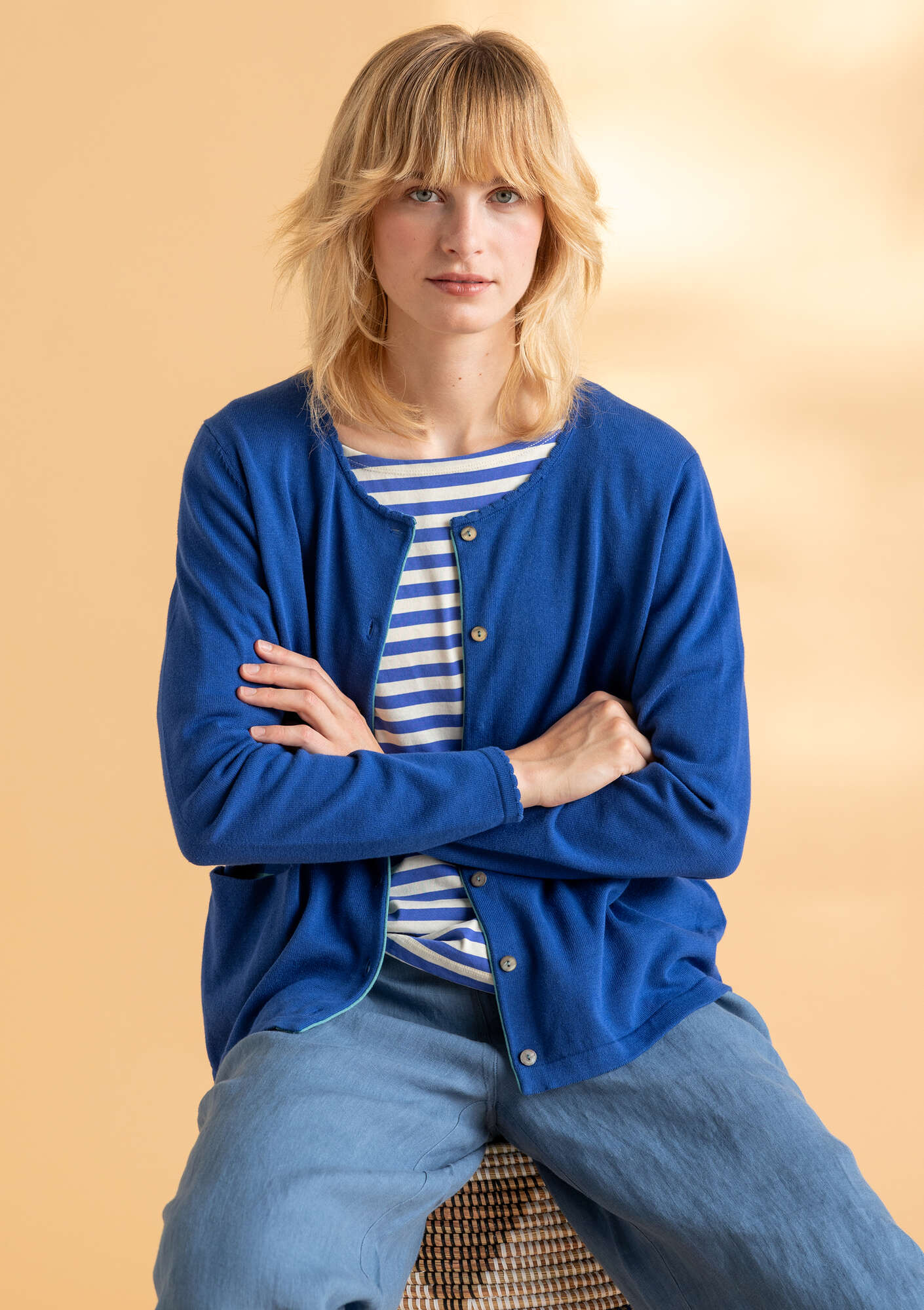 A simple style staple finished at the neck and cuffs with delicate scalloped edges. Accent-colour rolled edging at the front and as small playful details inside. Pocket in one side. Mother-of-pearl buttons.