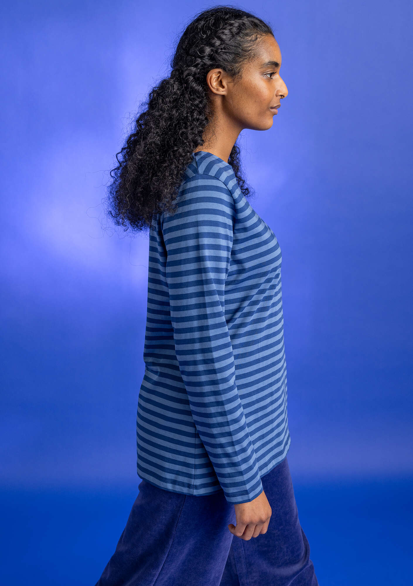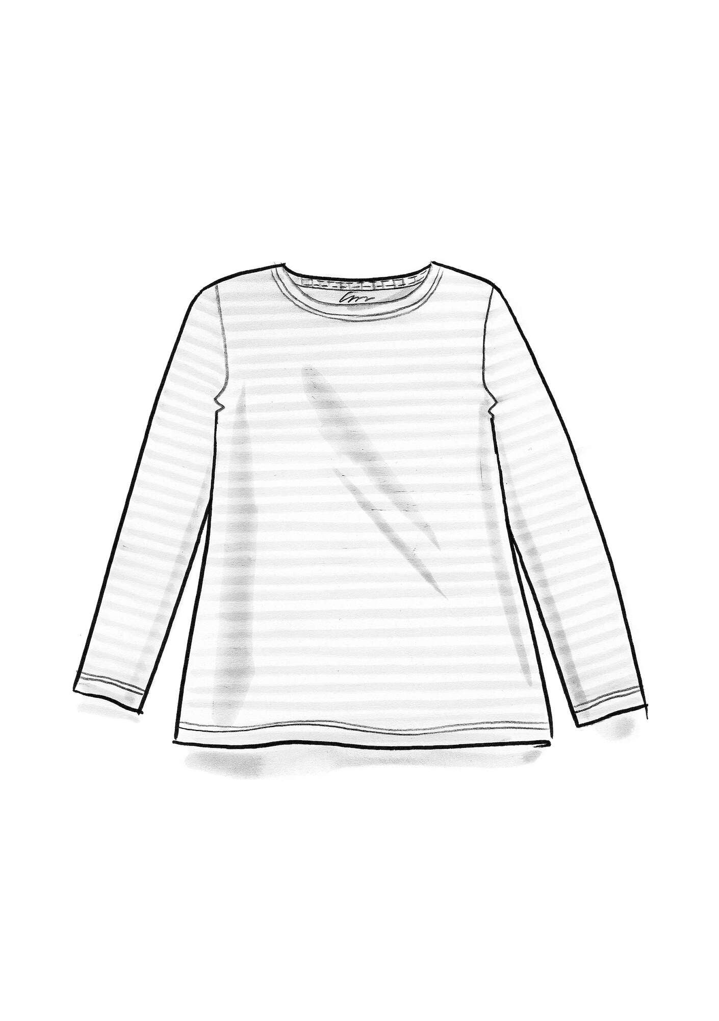 A yarn-dyed stripe and a simple silhouette with full-length sleeves. A gentle boat neckline with double needle stitching around the edge.