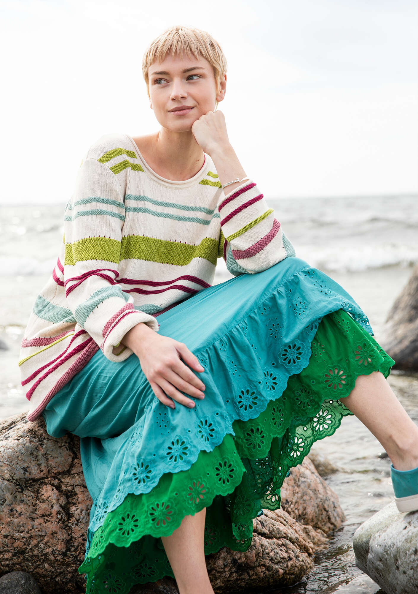 • A simple style with elasticated waist and floral broderie anglaise along the hem. A small button allows the elastic to be adjusted for a personal fit.