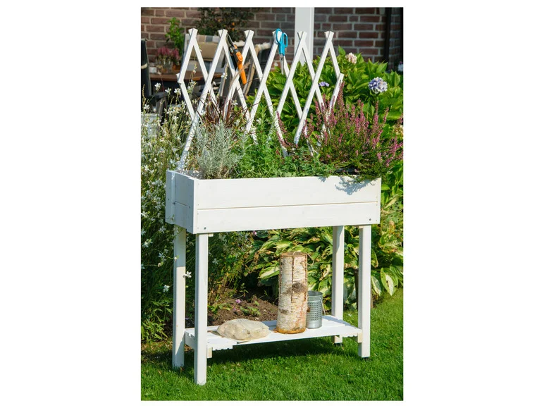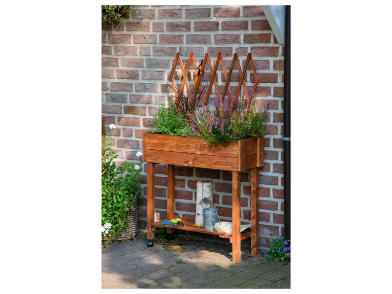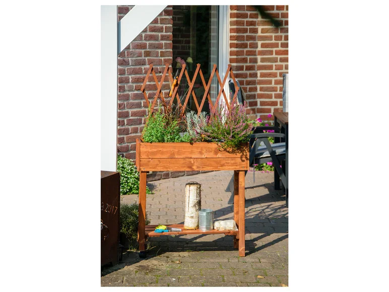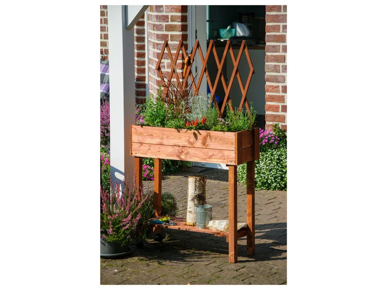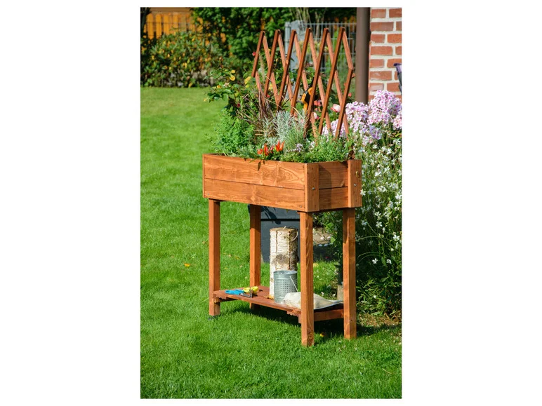Le parterre surélevé est en bois d'épicéa (Picea abies, essence principale) issu de la sylviculture européenne et est lasuré pour résister aux intempéries. Les dimensions extérieures sont d'environ 79 x 28,5 x 130 cm (L x l x H), les dimensions intérieures du bac à plantes sont d'environ 73 x 26 x 16 cm (L x l x H) et la hauteur est d'environ 87 cm.