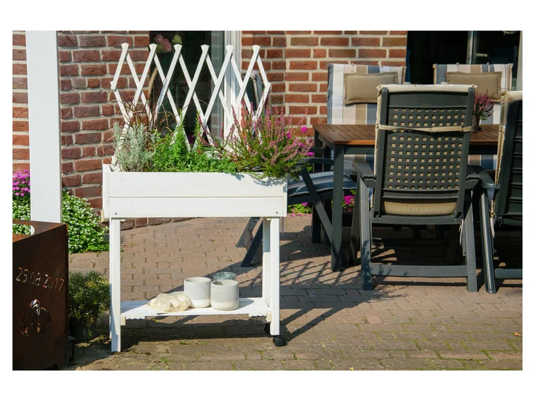Les roulettes robustes en plastique permettent de déplacer facilement le parterre, tandis que la surface de rangement sous la jardinière offre de la place pour les outils de jardinage, les arrosoirs et bien d'autres choses encore. Ainsi, tu as toujours les ustensiles nécessaires à portée de main lorsque tu plantes le parterre à une hauteur de travail qui ménage ton dos.