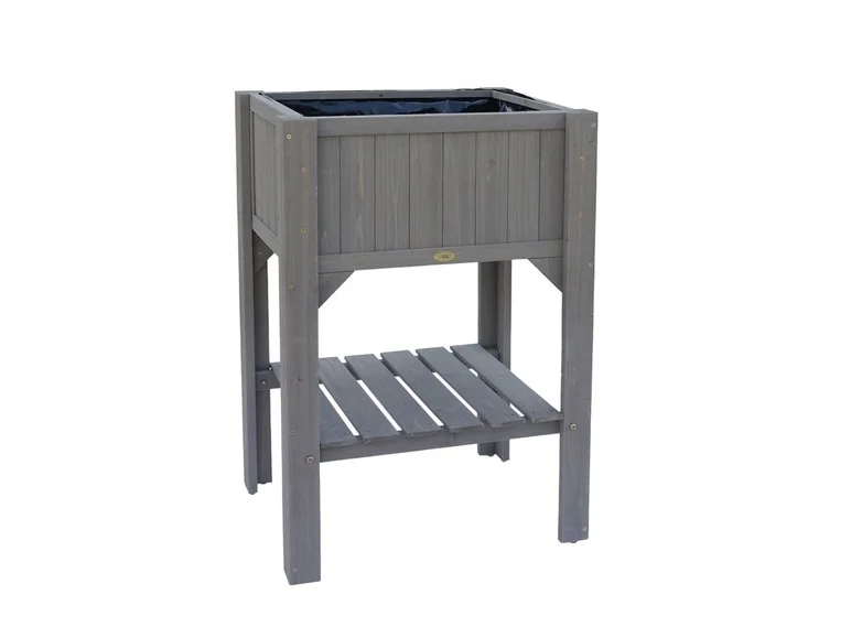 Parterre surélevé compact avec bâche perforée pour balcon ou terrasse. La dépose pratique située directement sous la plate-bande offre l’espace de rangement nécessaire pour stocker le terreau, les houes de jardin ou les pelles. La structure solide résiste au vent et aux intempéries, les pieds sont équipés de picots en plastique qui ménagent le sol et protègent en outre les semis de l’humidité du sol. Cet élégant parterre surélevé permet de créer en un tour de main une petite plate-bande avec des légumes, des herbes ou des fleurs. Il est entièrement garnie d’une bâche perforée. Le bois est ainsi protégé de l’humidité et la terre ne s’écoule pas.