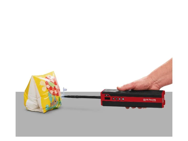 - Tuyau d'air comprimé intégré dans le boîtier avec 4 adaptateurs : valve (fixée au tuyau), valve de vélo, aiguille à ballon, adaptateur universel