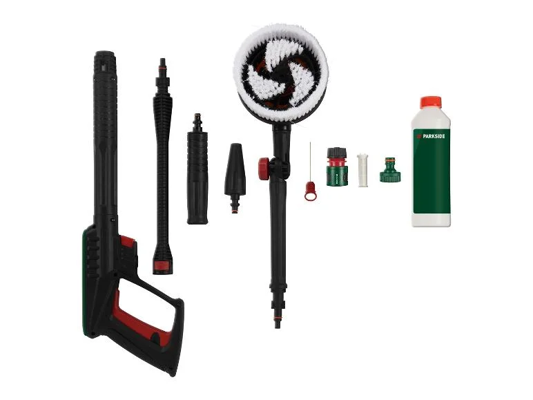 | Accessoires inclus : | 1x poignée de pistolet, 1x lance, 1x buse Vario standard, 1x fraise à saleté Turbo, 1x brosse de lavage rotative avec articulation, 1x aiguille de nettoyage de buse, 1x raccord d'eau avec filtre, 1x raccord rapide avec adaptateur pour tuyau d'arrosage, 10 m tuyau haute pression, 1x bouteille de détergent (500 ml) |