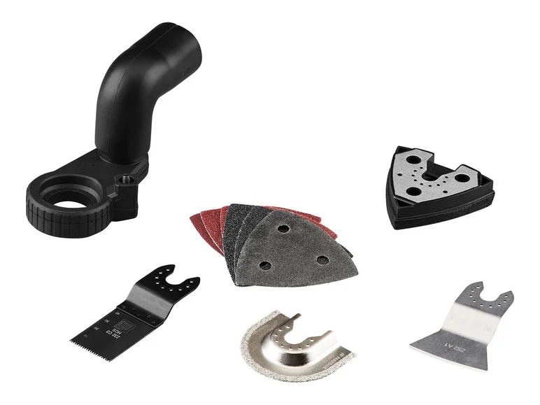 Accessoires inclus : 1 lame de scie plongeante HCS, 1 lame diamant, 1 grattoir, 1 plateau de ponçage triangulaire, 6 feuilles abrasives (bois : grain 60/80/120, métal : grain 60/80/120)