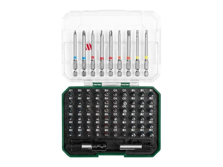• Embouts de 25 mm : 6 x PH, 6 x PZ, 6 x fente, 6 x Torx, 6 x Torx avec trou, 6 x six pans