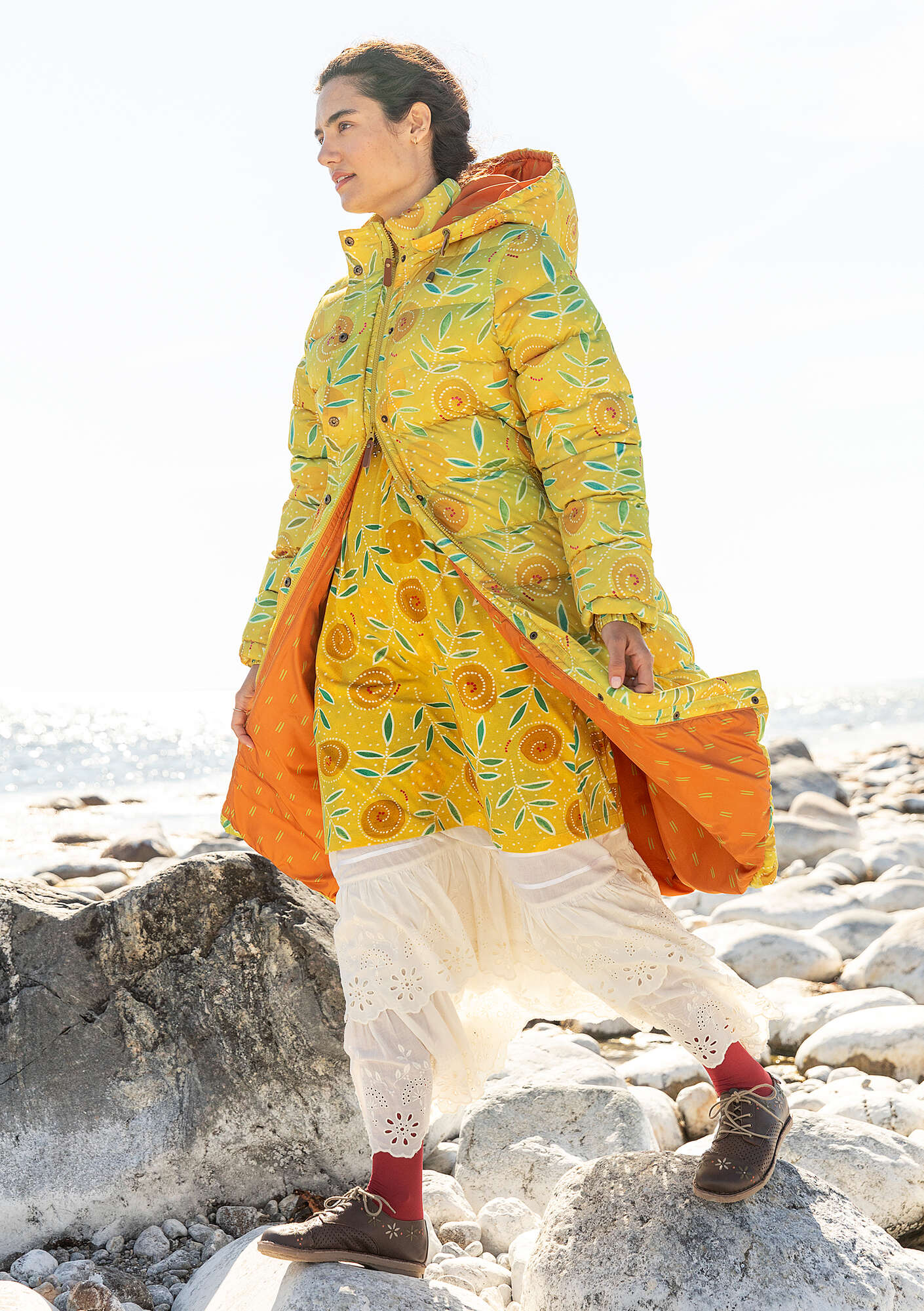 100% polyester shell fabric and lining. The polyester is recycled. Padding 90% down 10% feathers. Recycled filling material. The polyester, filling material and print are certified as compliant with environmental standards. We are reducing our impact on the environment by using recycled materials. The fabric has a water-repellent, PFC-free finish. Delicate wash at 40°. It is advisable to rinse it twice. Do not use fabric softener. Tumble dry at a low temperature with at least three drier balls until the jacket is completely dry. Made in Zhejiang, China.