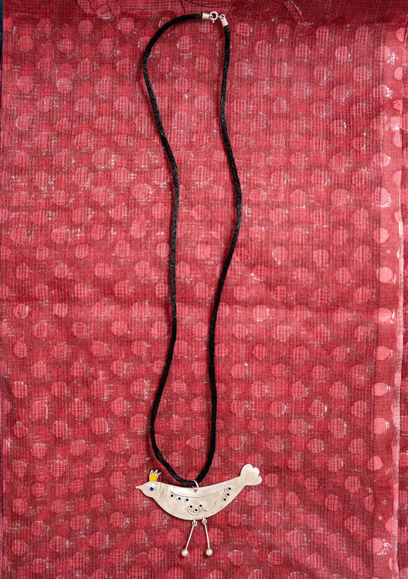• Charming necklace with a 925 sterling silver, bird-shaped pendant, in relief and with details worked in enamel. 62-cm-long cord with a silver clasp. Comes in a small cloth bag with a printed design.
