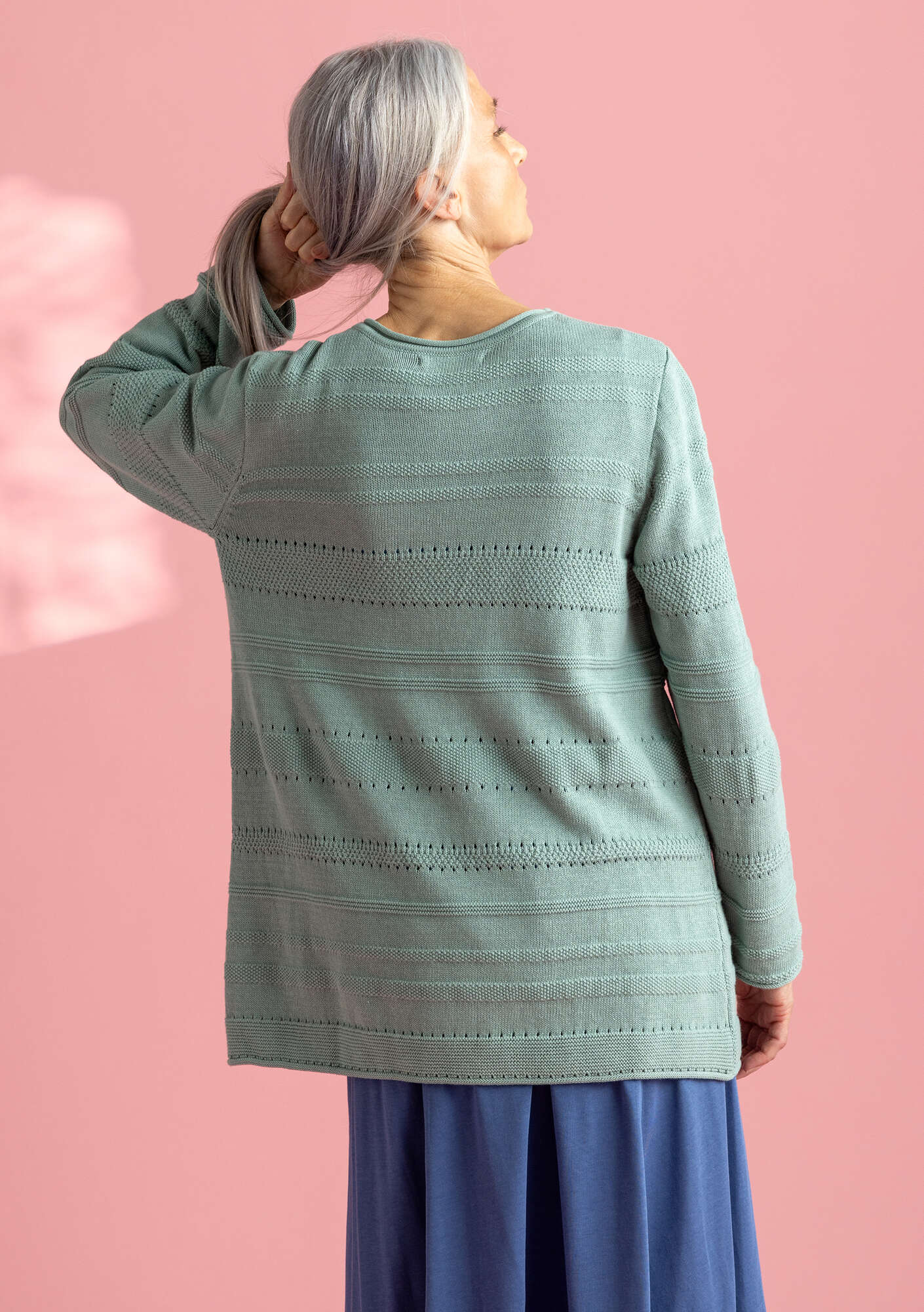 Easy-to-wear sweater with full-length sleeves. Textured stripes and small, neat borders in a pointelle knit. Pretty rolled-edge cuffs and hem. Comes in solid colours and multicoloured.