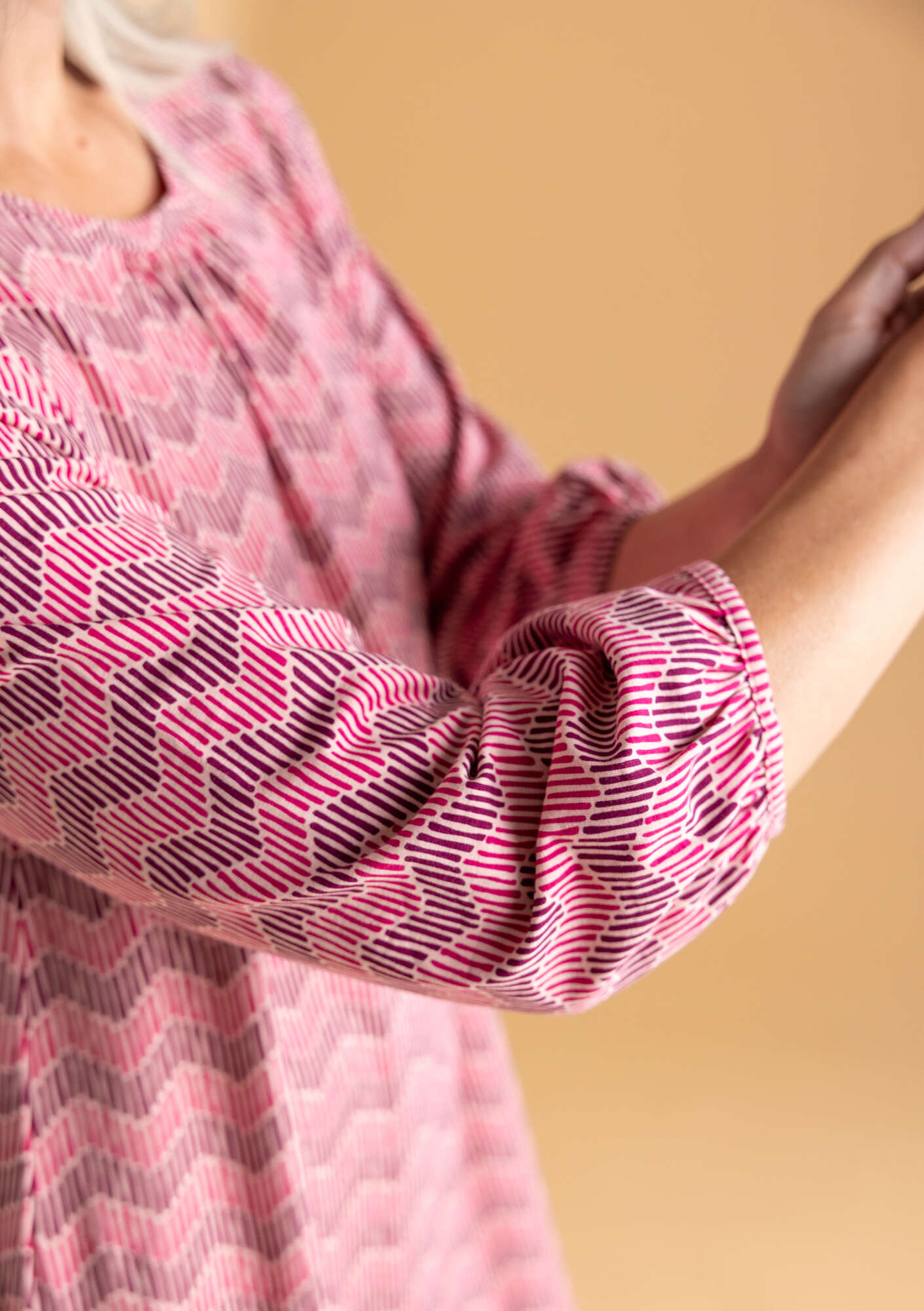 • Simple silhouette with three-quarter sleeves. Soft gathers at the cuffs and front of the neck create a flattering fit. Available in solid colour and print options. Side pockets.