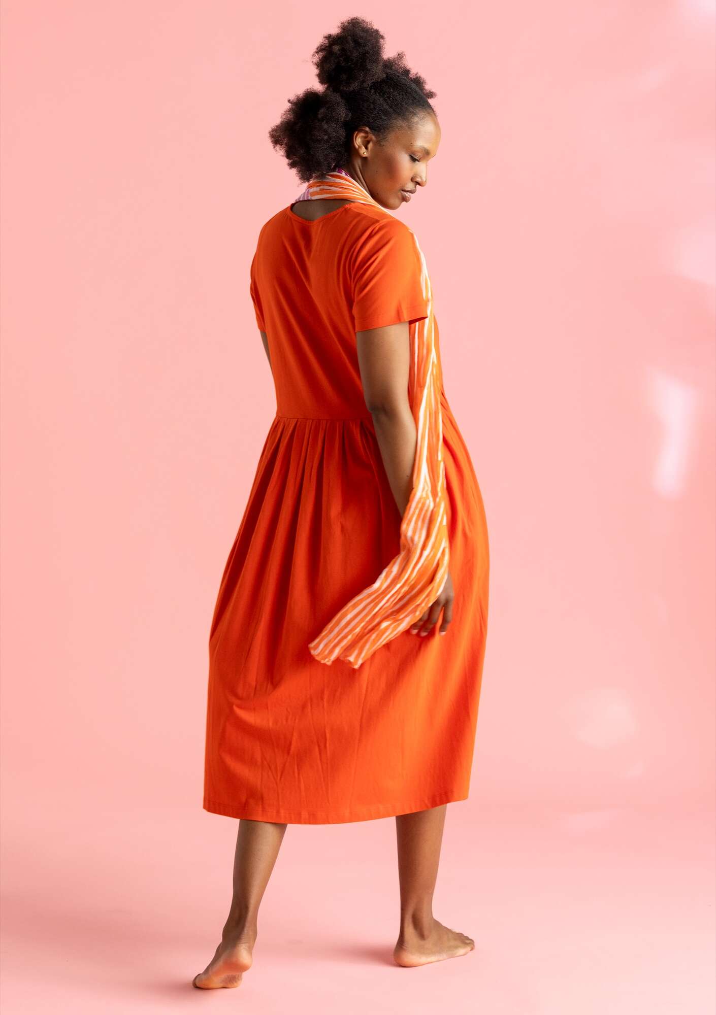 • Longline, v-neck dress with t-shirt sleeves. A pleated waist seam adds flare to the skirt. Practical side pockets.