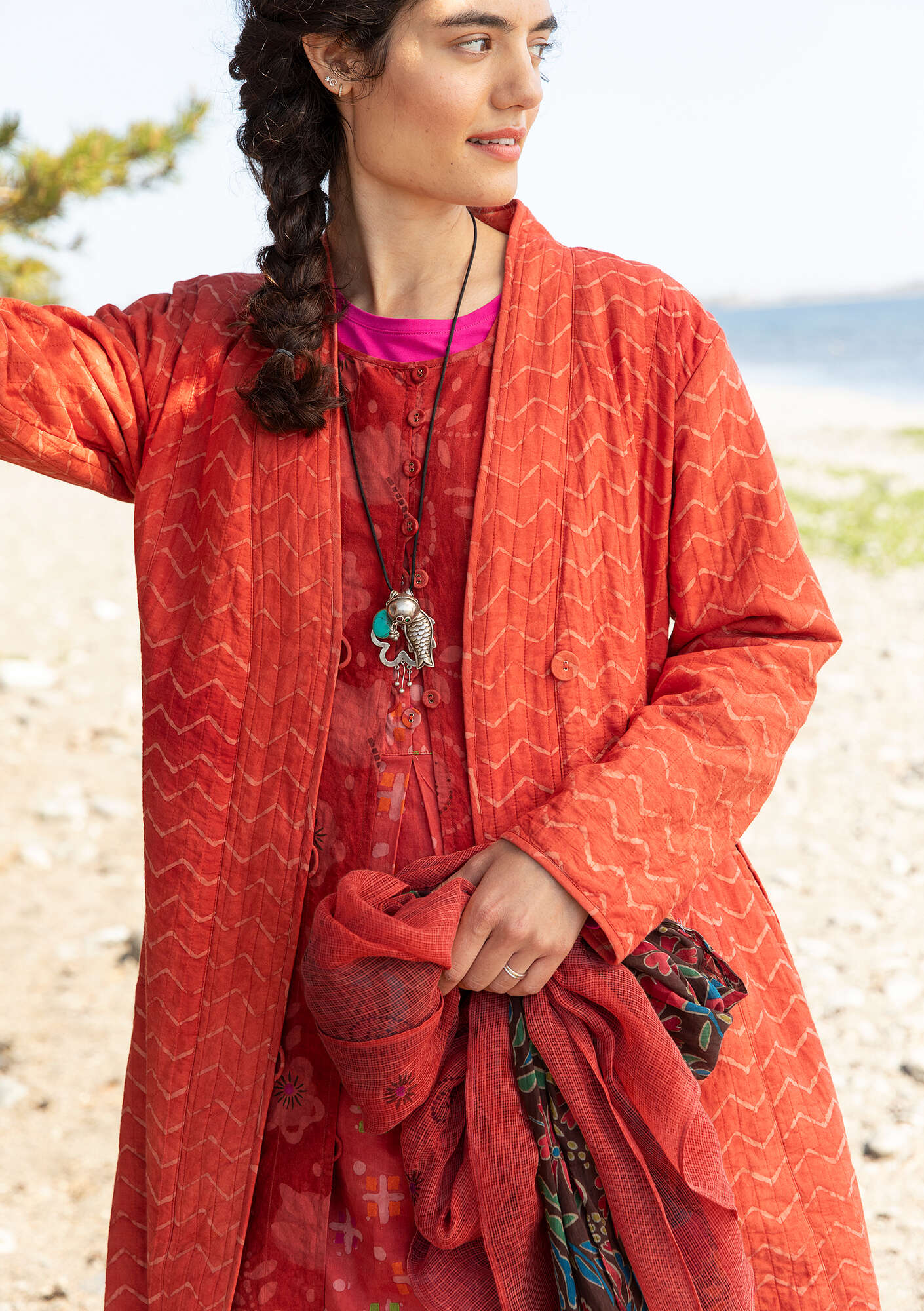 • This reversible coat is a real handcrafted gem. The pattern on the quilted fabric has been block printed with a mud resist technique and dyed with plant materials. Shawl collar, fabric-covered buttons and front pockets. Full-length sleeves.