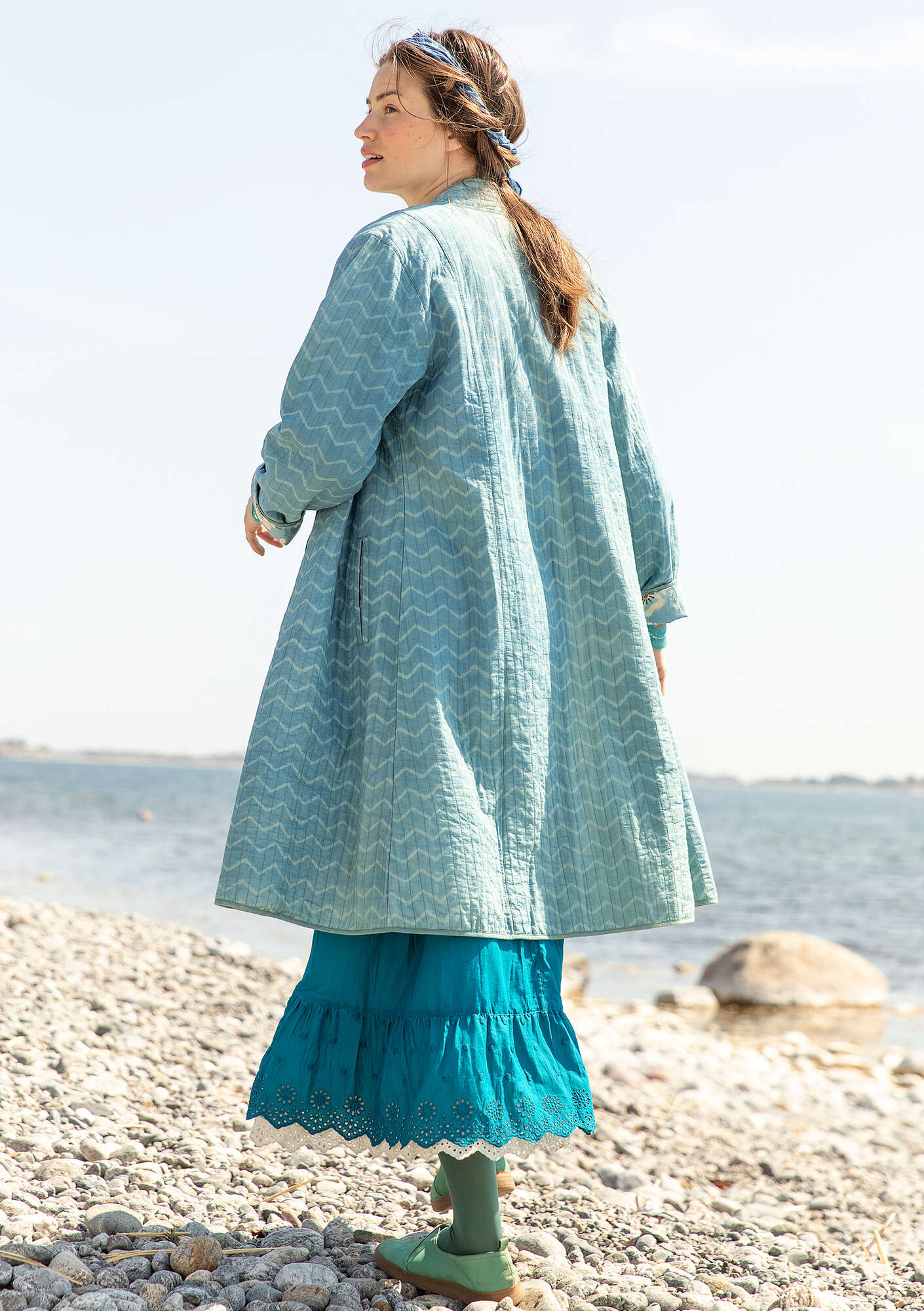 This reversible coat is a real handcrafted gem. The pattern on the quilted fabric has been block printed with a mud resist technique and dyed with plant materials. Shawl collar, fabric-covered buttons and front pockets. Full-length sleeves.