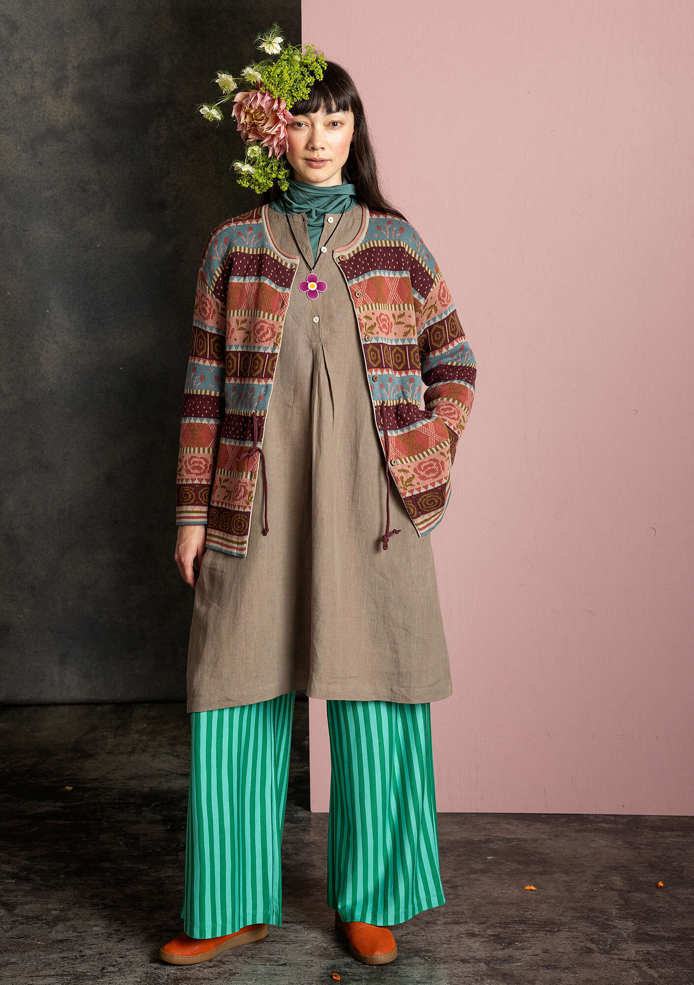 • Jacquard cardigan in a chunkier knit. Featuring full-length sleeves, a round neckline and natural colour wooden buttons. A knitted drawstring at the waist allows for easy fit adjustment.