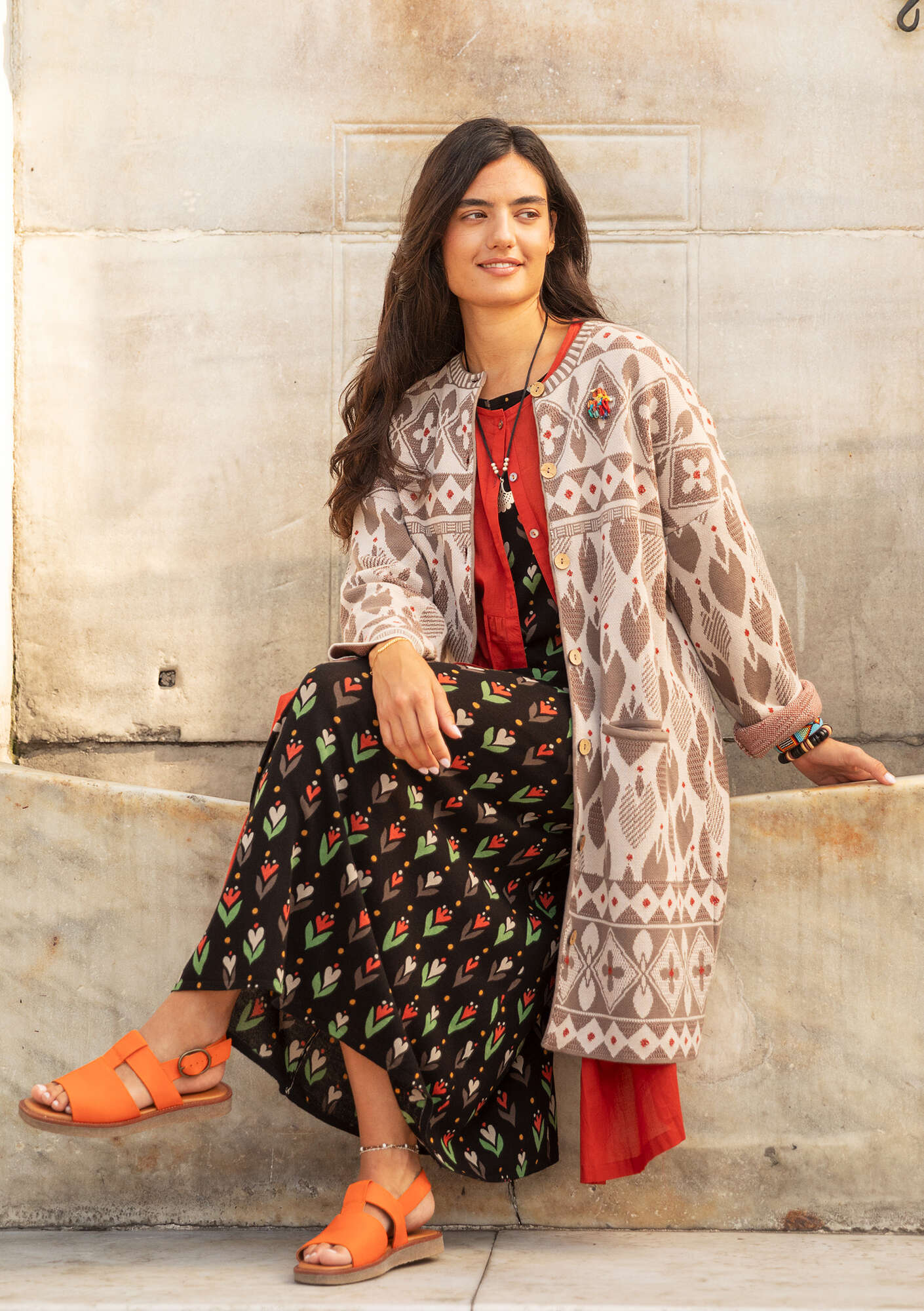 • Textured knit jacquard fabric featuring a pattern of tulips framed by borders. Longline coatigan with a round neck, long sleeves and two patch pockets. Coconut shell buttons.