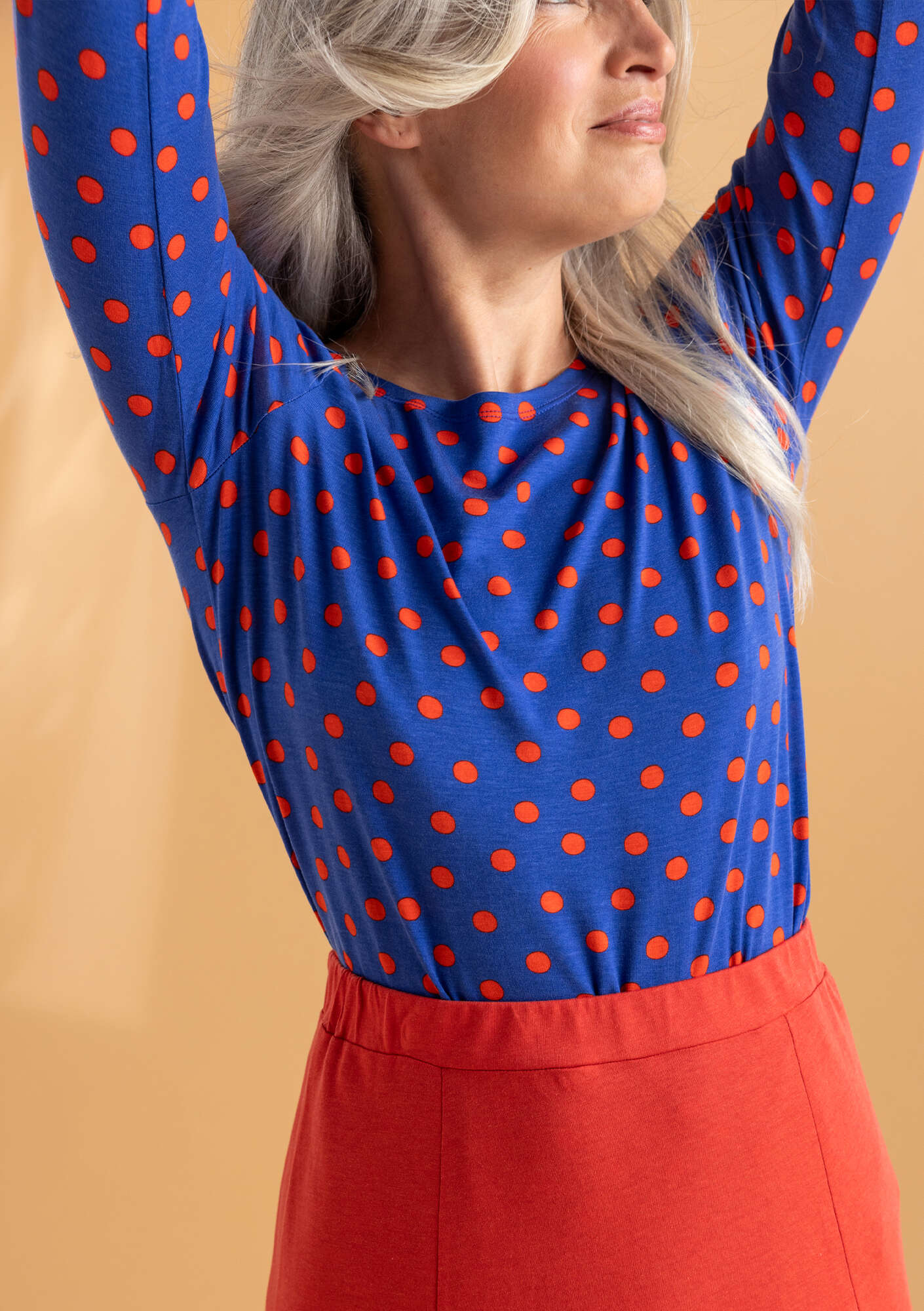 • Simple, slip-on and go style. Round neckline and full-length sleeves. Available in solid colours and with a dot print.