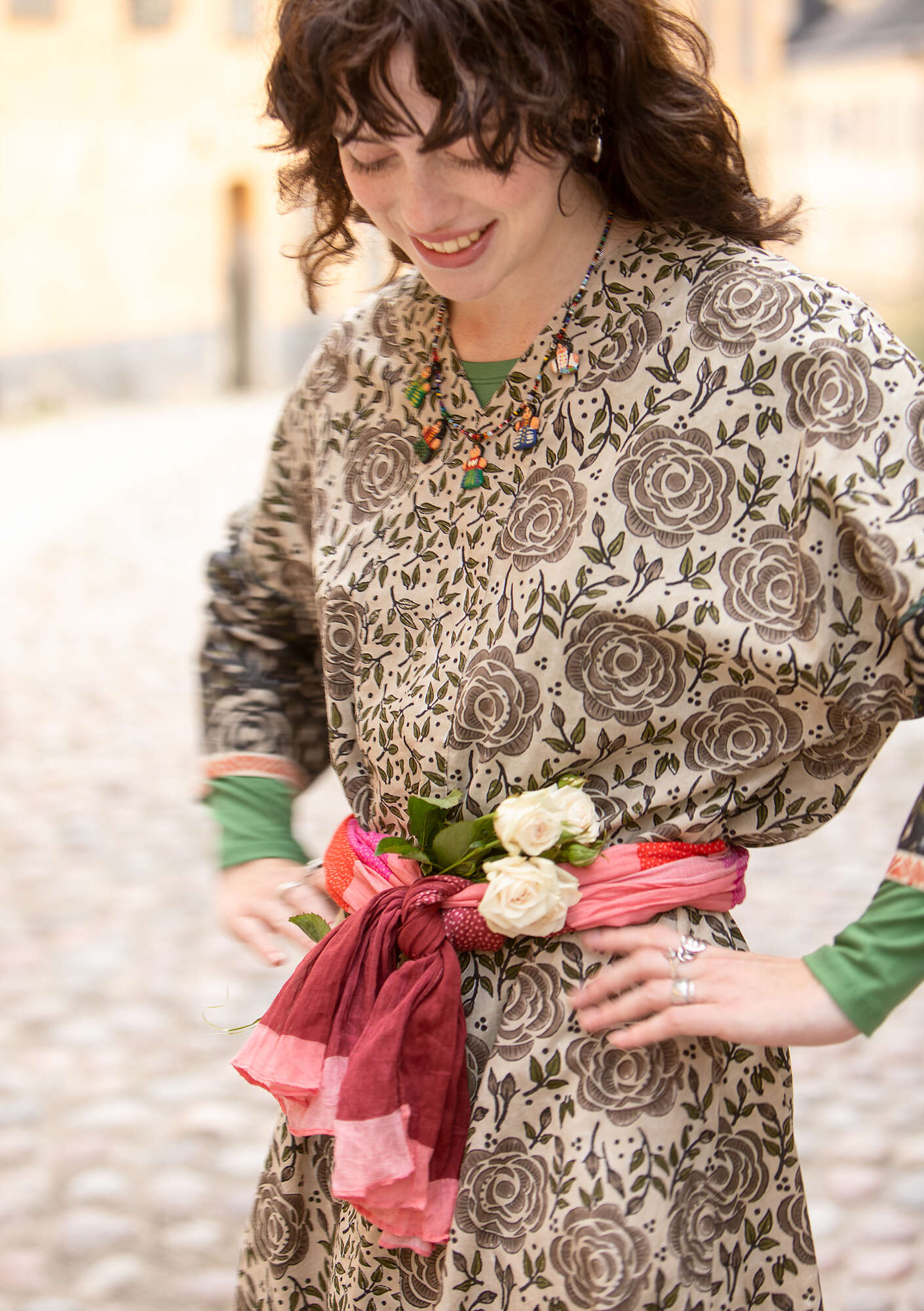 100% cotton. The cotton is certified organic. The garment is block-printed by hand. Delicate wash at 30°. Iron on medium heat. 2-3% shrinkage. Made in Bagru, India.