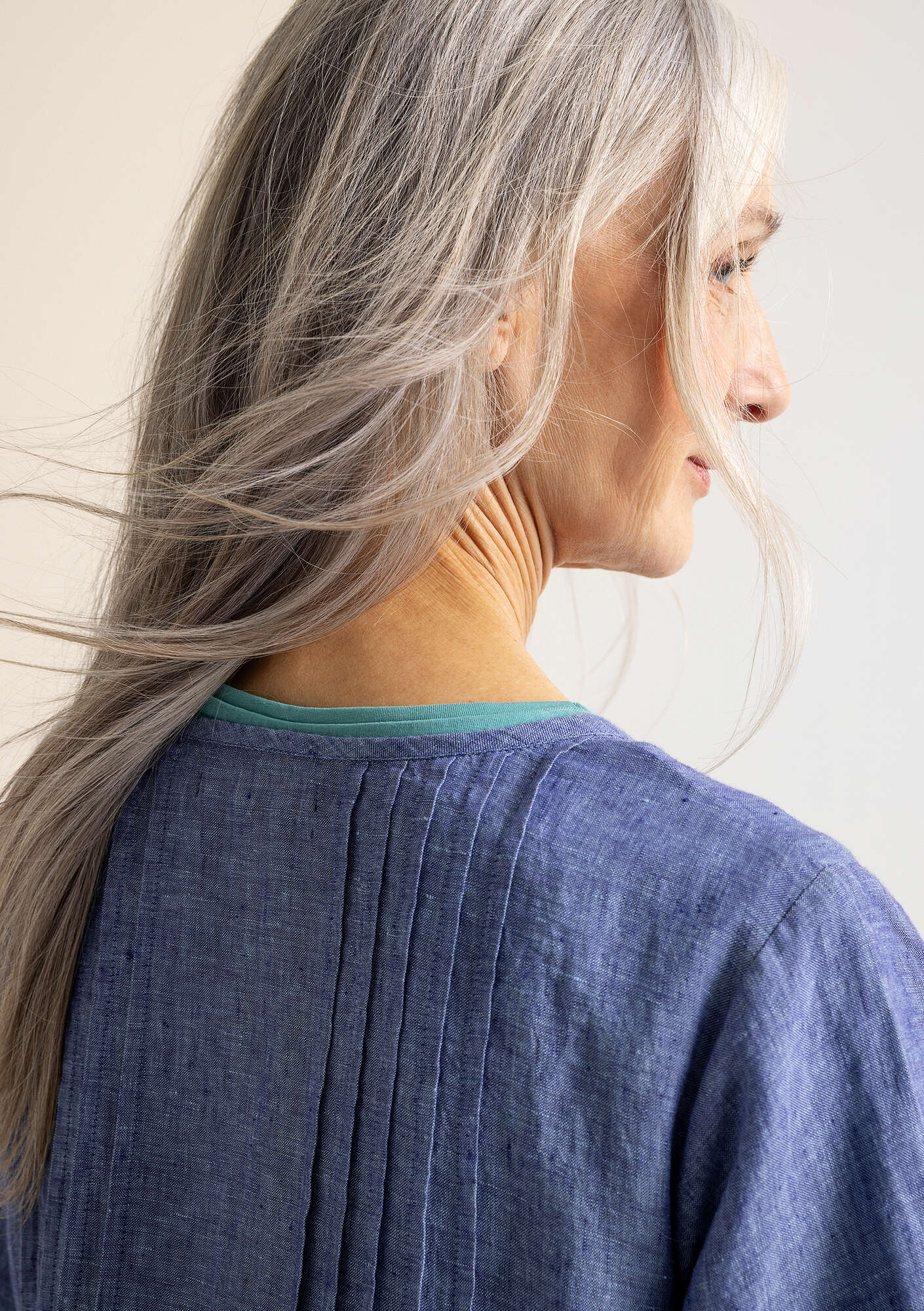 • Button-through dress with front and back vertical pleats. Elbow-length sleeves and side pockets. Choice of solid colours, a checked pattern and a chambray weave.