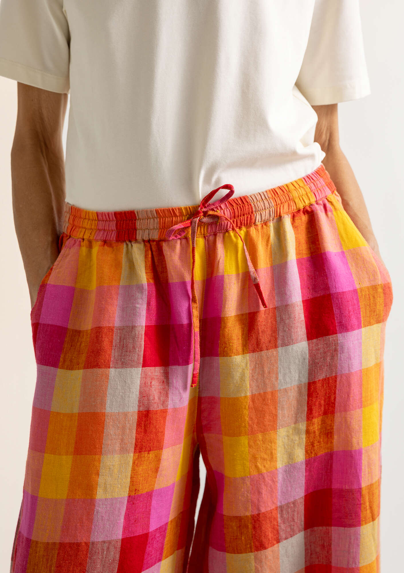 Wonderful, loose-fitting, full-length legs. Handy side pockets. Elasticated waistband with front drawstring. Choice of solid colours, a checked pattern and fine chambray weave.