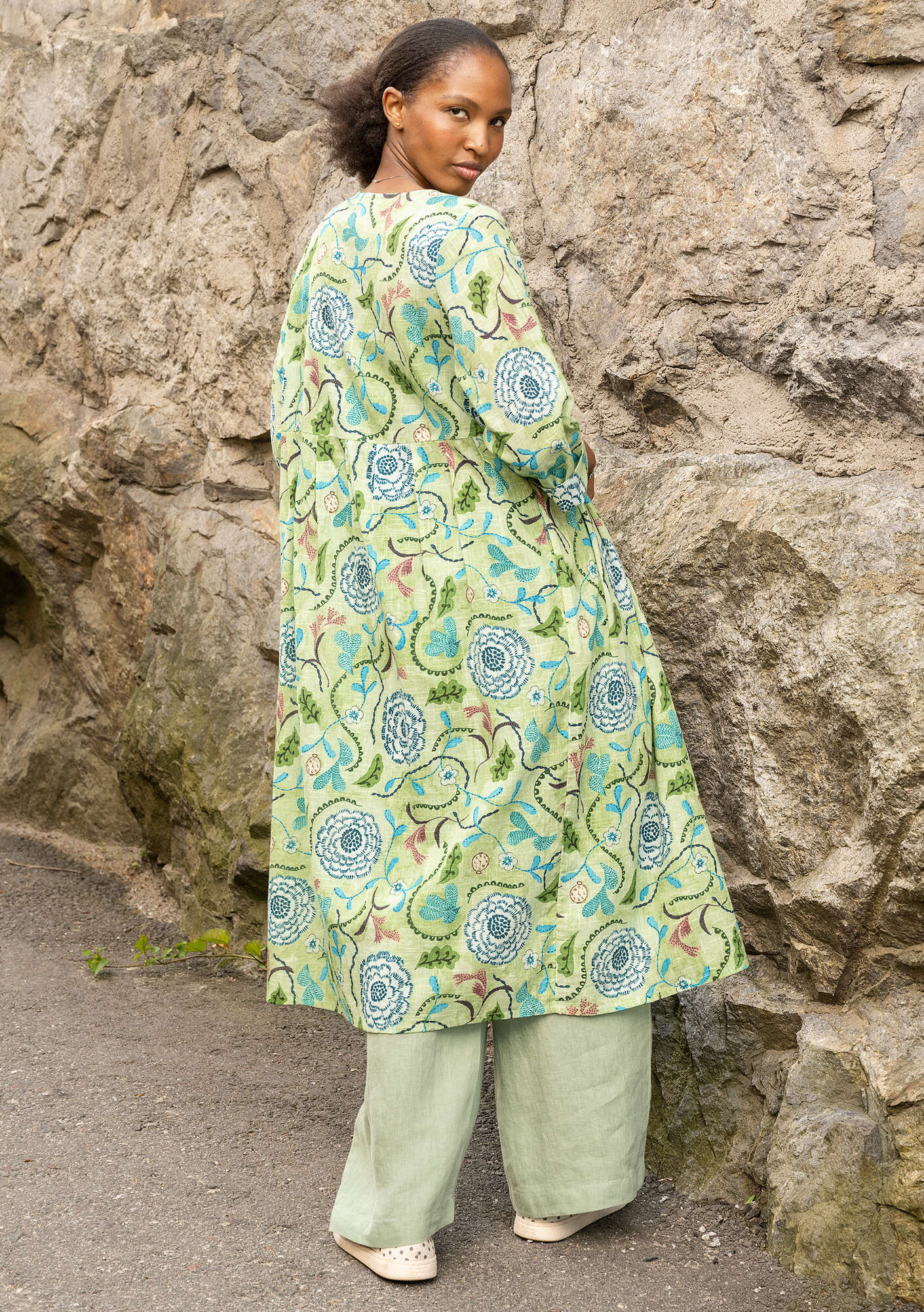 The fabric has three different digital print designs and a textured slub finish. Button-through style with a round neckline and three-quarter sleeves. Practical side pockets and mother-of-pearl buttons. The skirt is softly gathered at the waist seam.