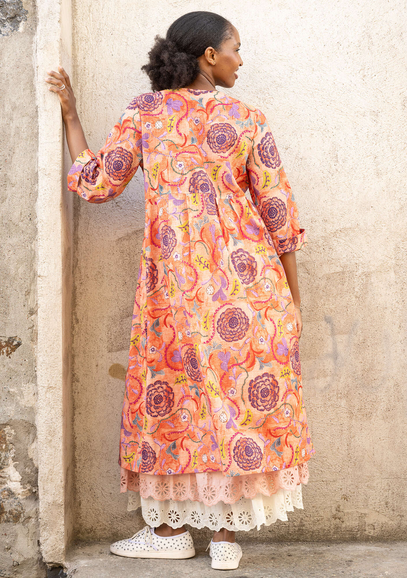 The fabric has three different digital print designs and a textured slub finish. Button-through style with a round neckline and three-quarter sleeves. Practical side pockets and mother-of-pearl buttons. The skirt is softly gathered at the waist seam.