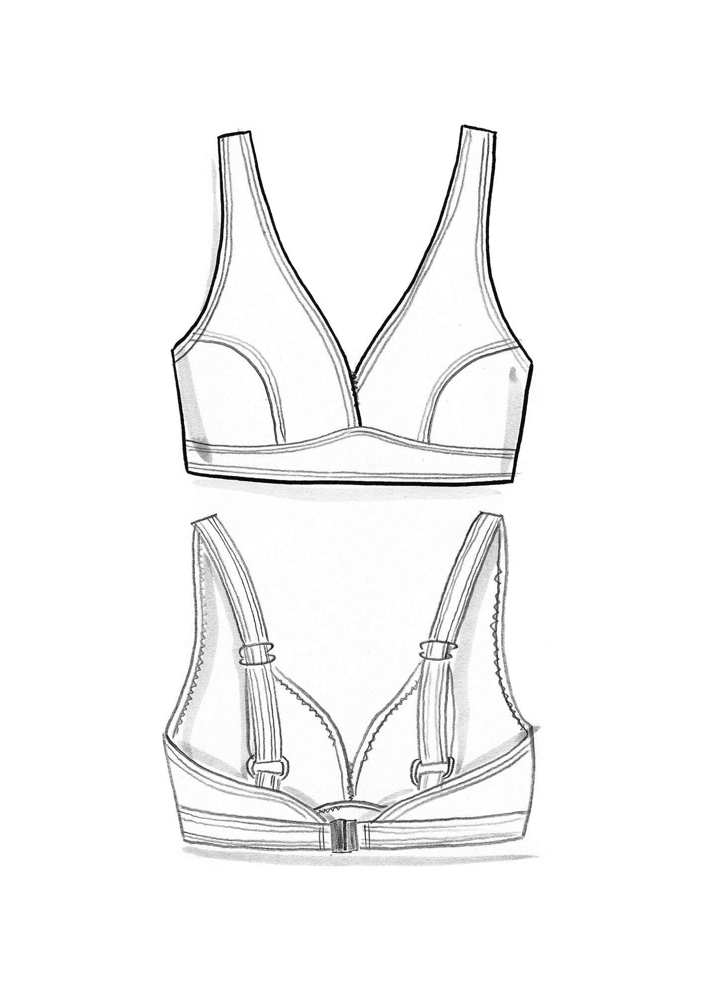 Bikini top with more coverage. V-neck with tailored bust. Adjustable shoulder strap and back-fastening. Available in black and with two printed designs.