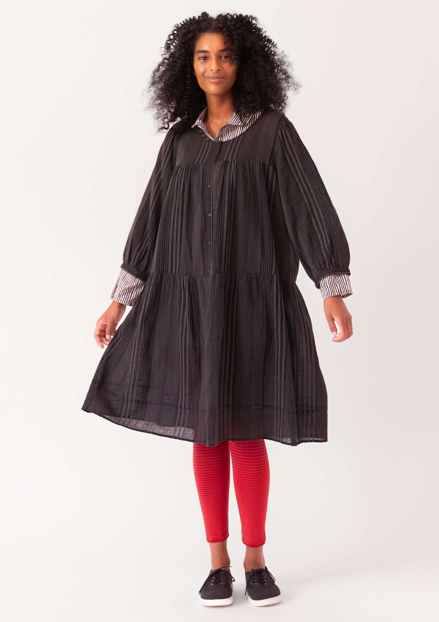 • Dress with front and back yoke. The fabric is gathered at the top of each tier to create pretty volume through the skirt. Button-through style. Three-quarter puff sleeves. Pleat stitched in the hem of the skirt.