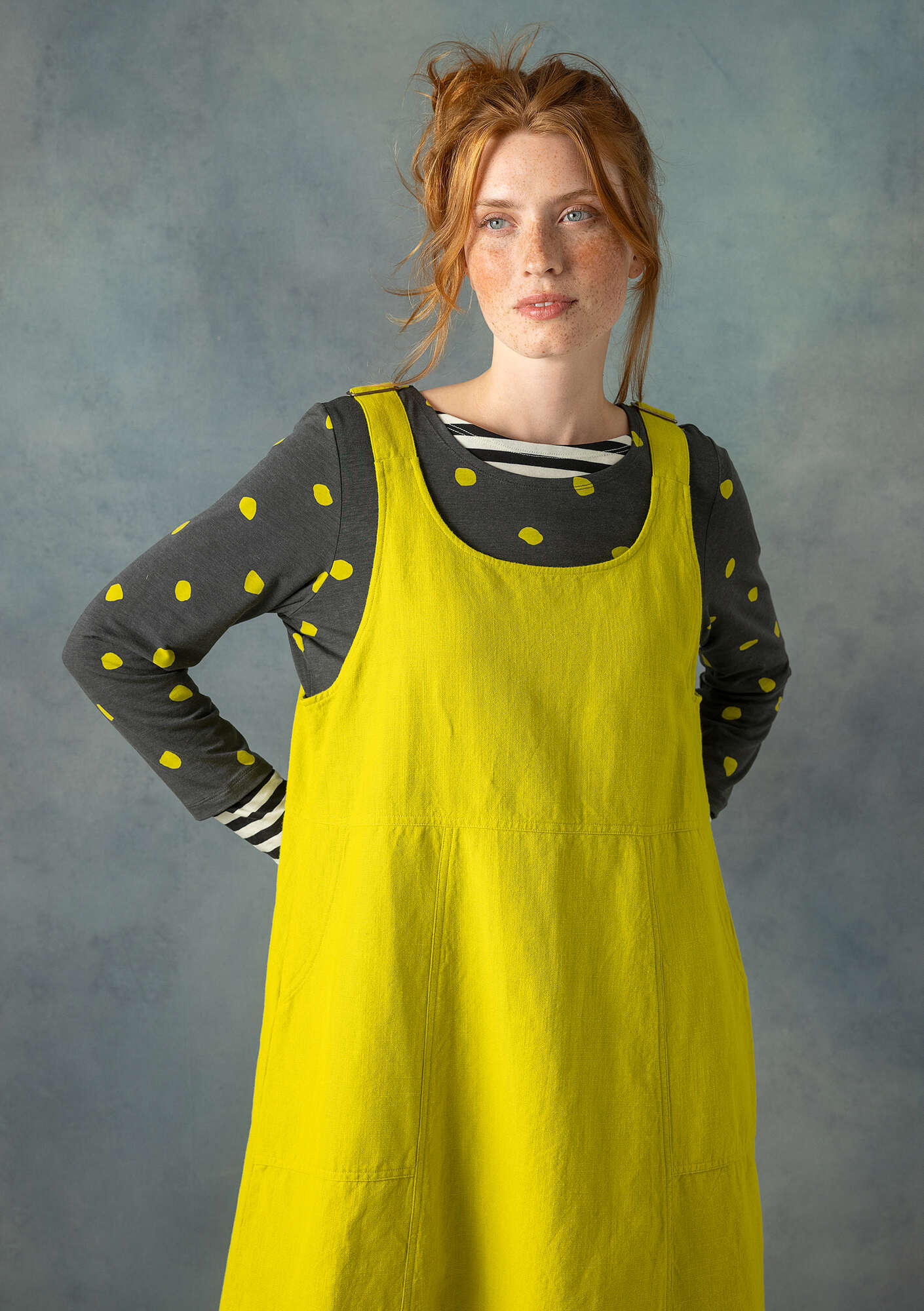 Cut from a comfortable cotton and linen blend slub weave fabric. Featuring adjustable shoulder straps, decorative seams and metallic trim. The skirt flares out from the waist seam and has classic workwear patch pockets.
