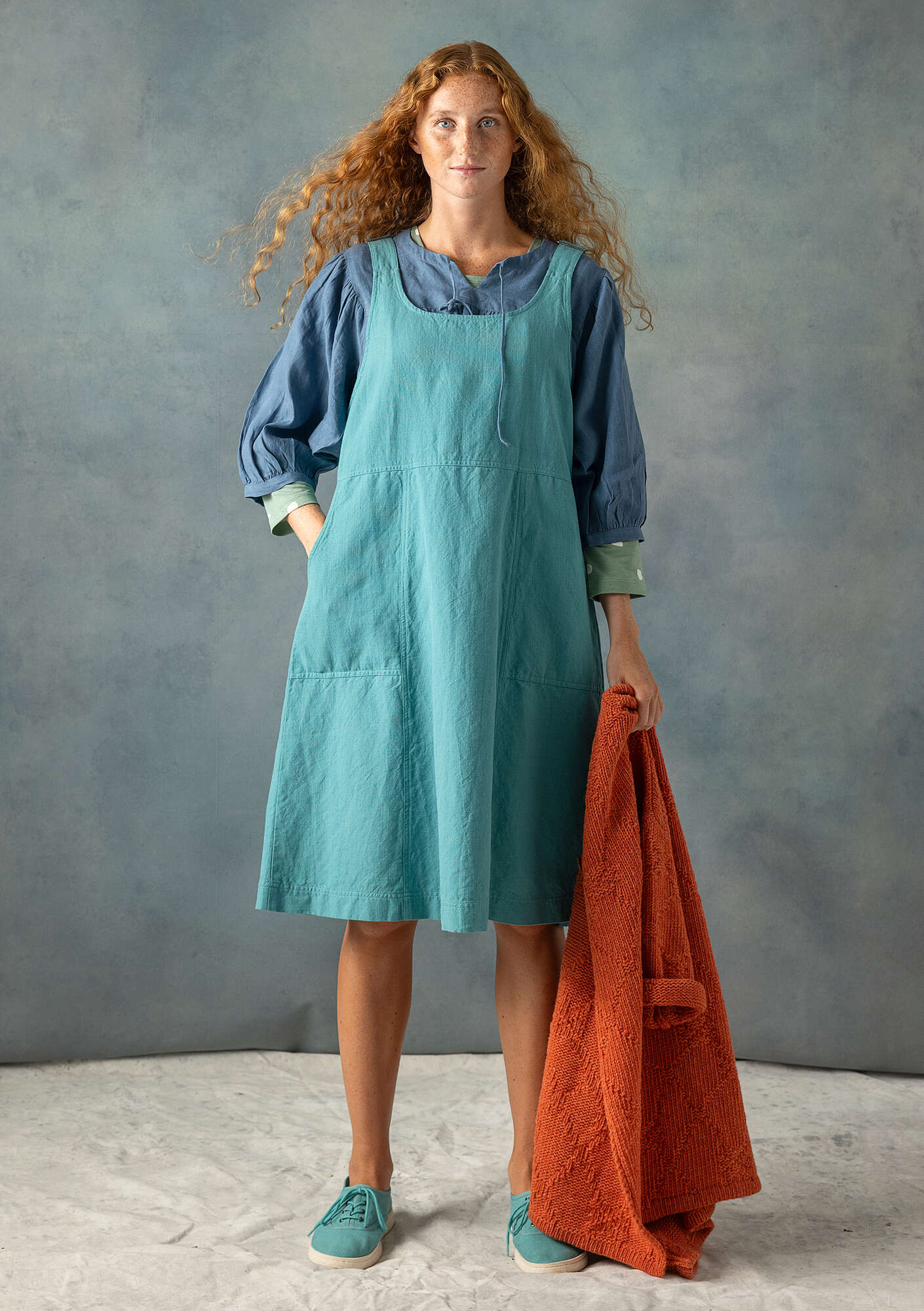 Cut from a comfortable cotton and linen blend slub weave fabric. Featuring adjustable shoulder straps, decorative seams and metallic trim. The skirt flares out from the waist seam and has classic workwear patch pockets.