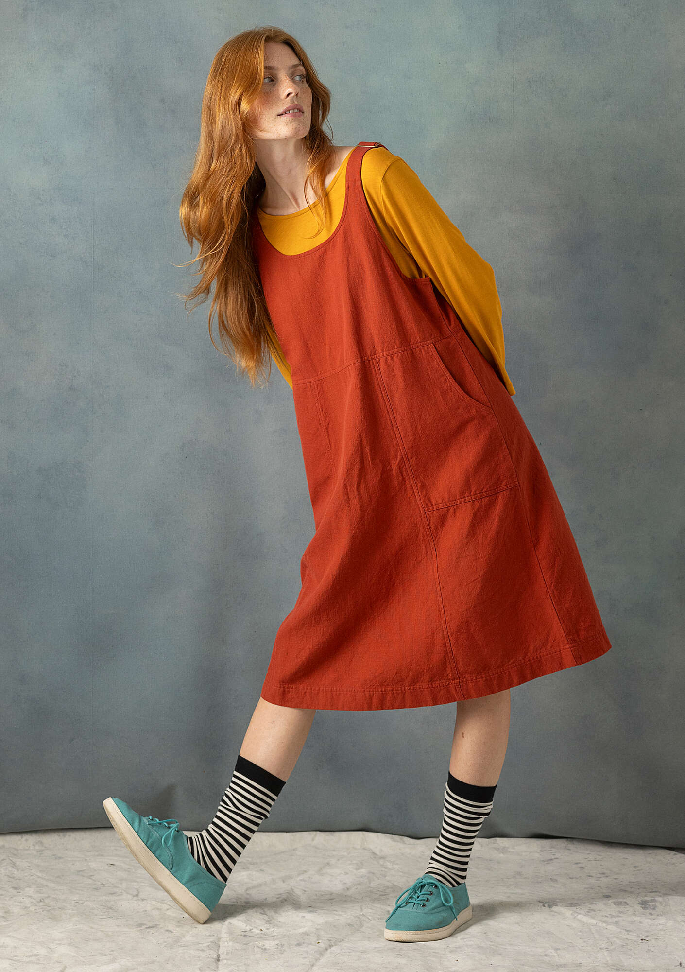 Cut from a comfortable cotton and linen blend slub weave fabric. Featuring adjustable shoulder straps, decorative seams and metallic trim. The skirt flares out from the waist seam and has classic workwear patch pockets.